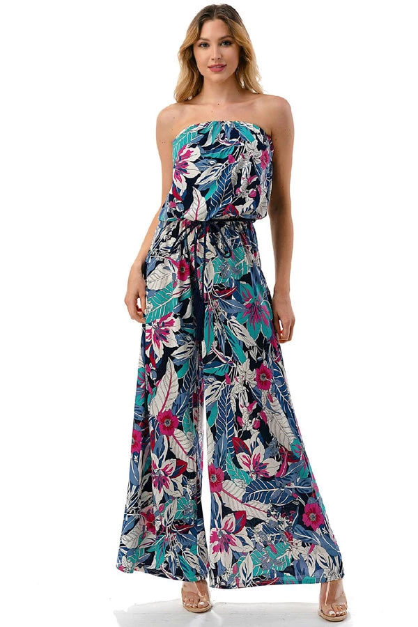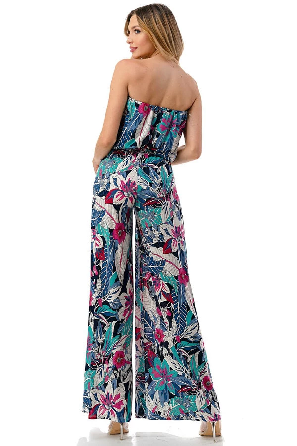 Tropical belted strapless jumpsuit with a silky soft fabric. Versatile. Throw on a denim jacket for a casual look or with a white cardigan to dress it up.Â