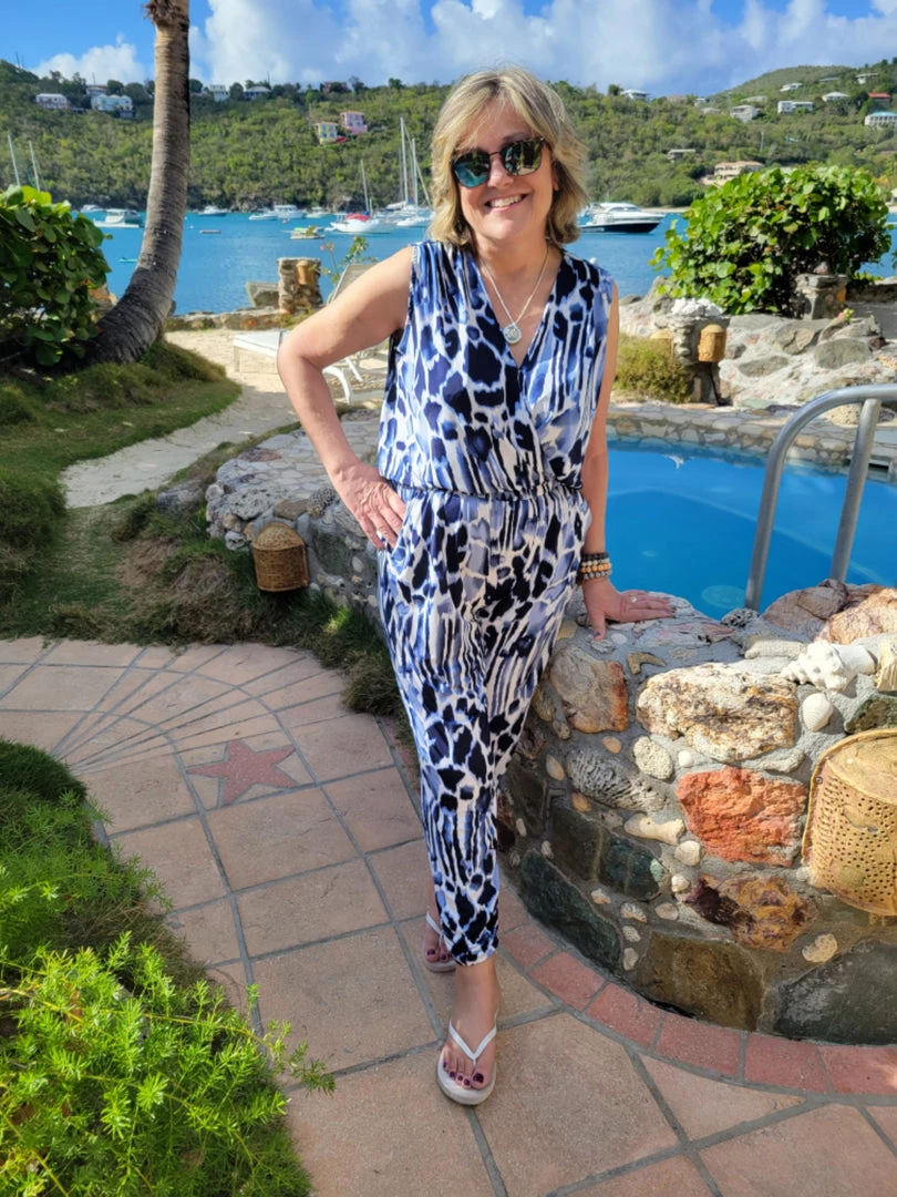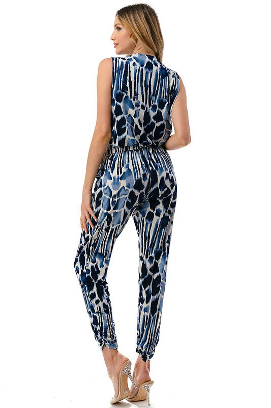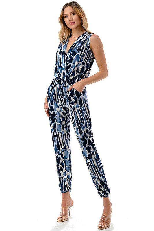 Gorgeous crossover jogger jumpsuit with pockets in a fun print for spring. The fabric is a great silky soft.Â