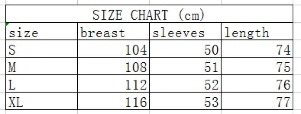 - Size chart in images
