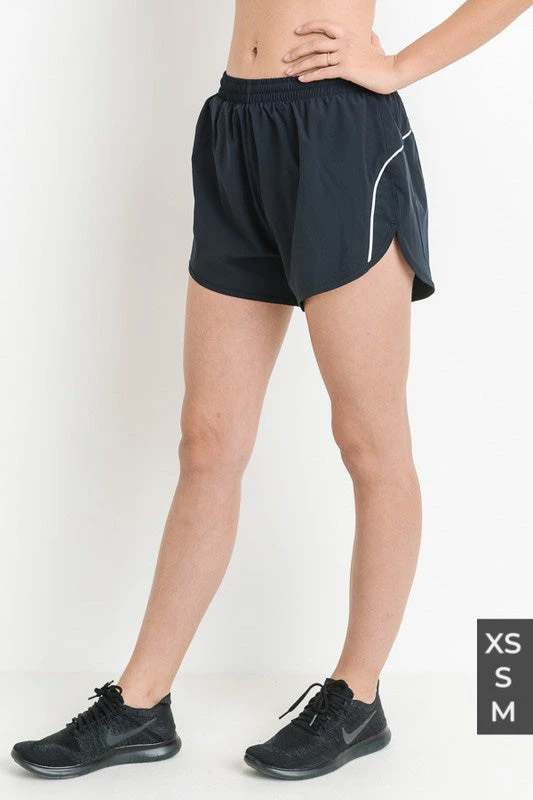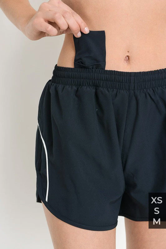 Lightweight performance fabrication, stripe accent detail, elastic waistband, and small pockets both in the inside of the front waistband and on the back with concealed zipper for your valuables.