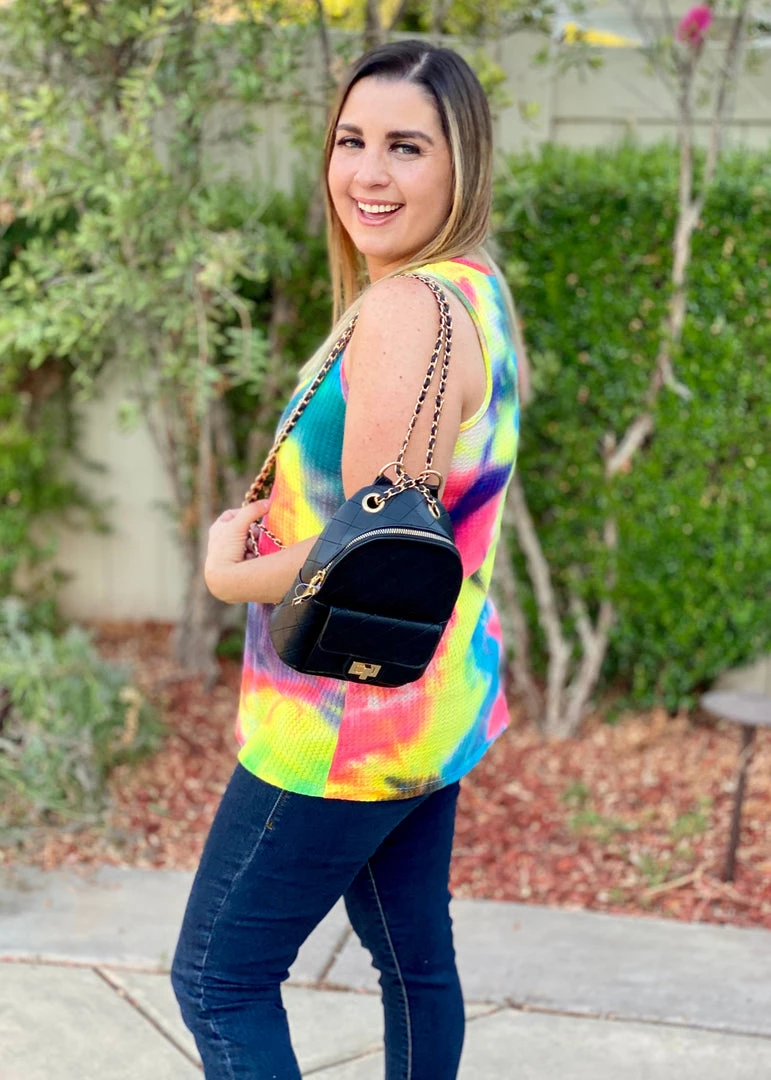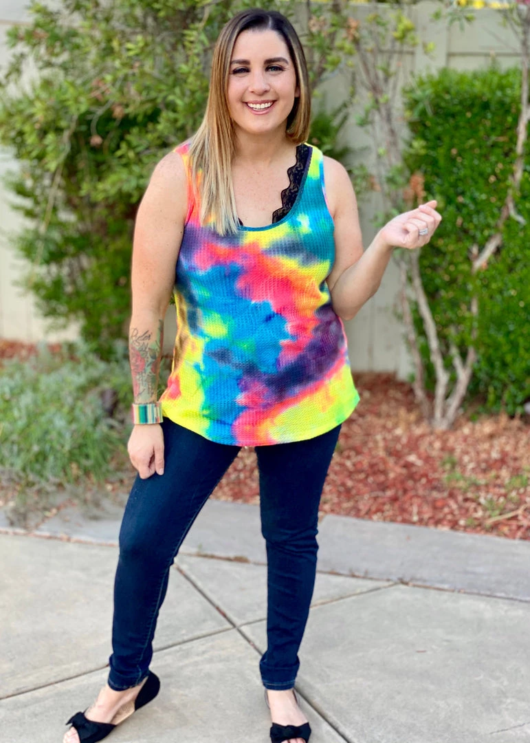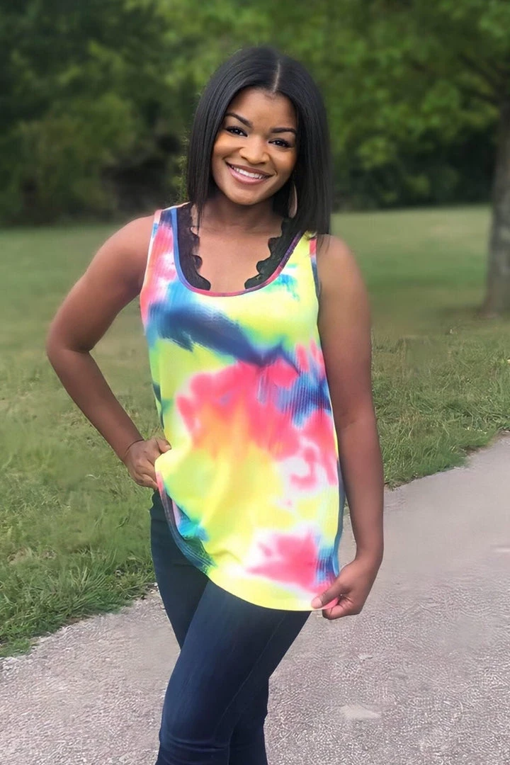 The neon colors in this amazing tie dye tank gives us a nostalgic feel from the 80’s. With a relaxed fit, this tank features no fuss straps and lace detailing around the scoop neck.