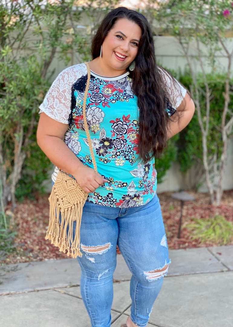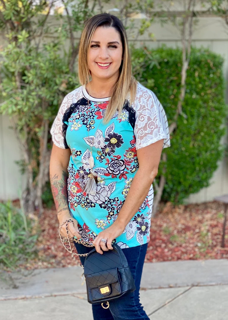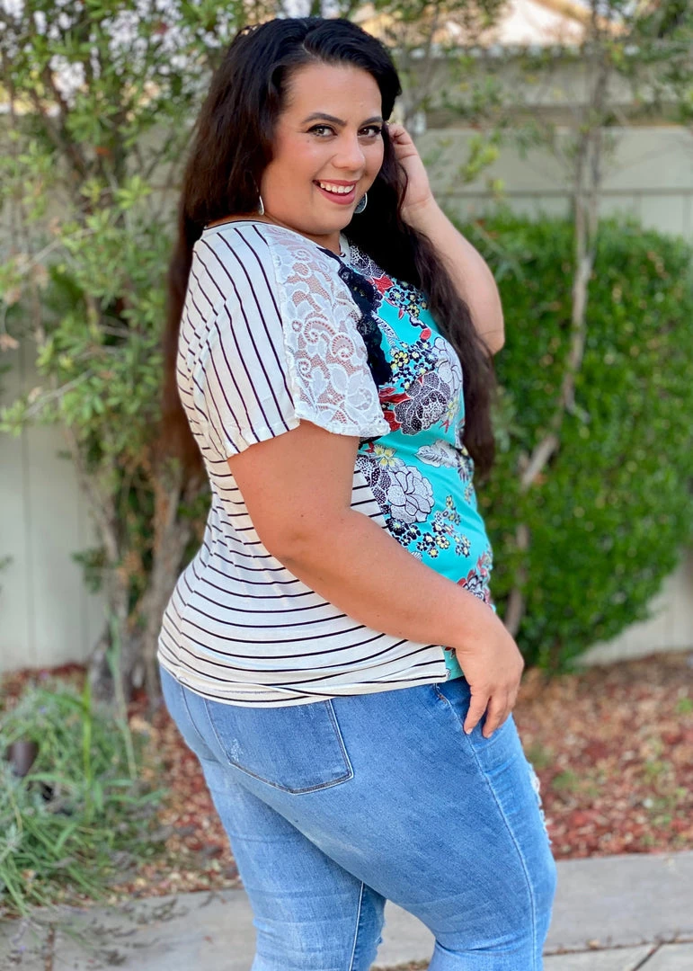 This is pattern mixing at it’s finest! With a floral printed front and striped back, we are loving the lace raglan sleeves.