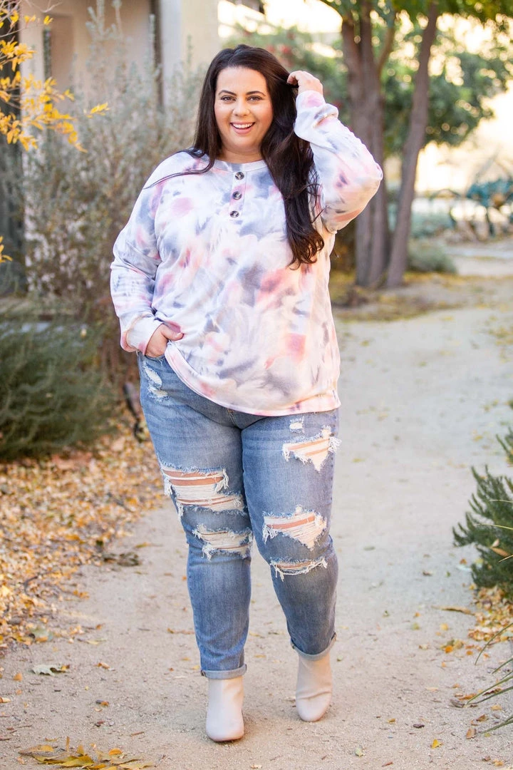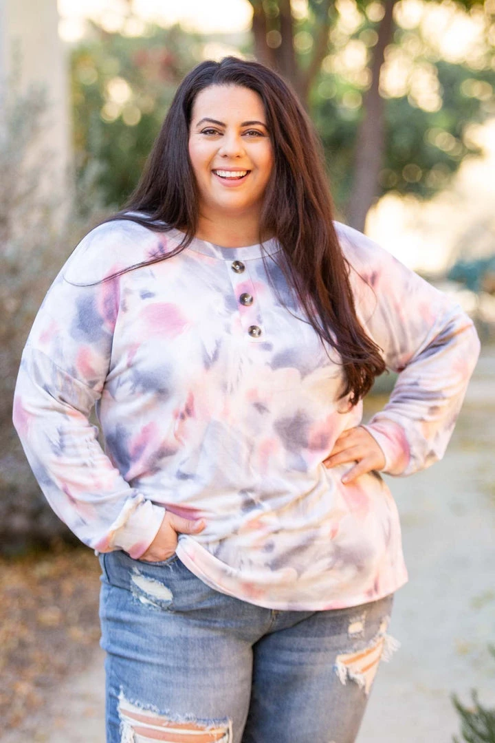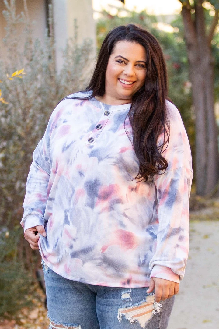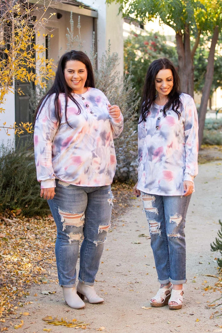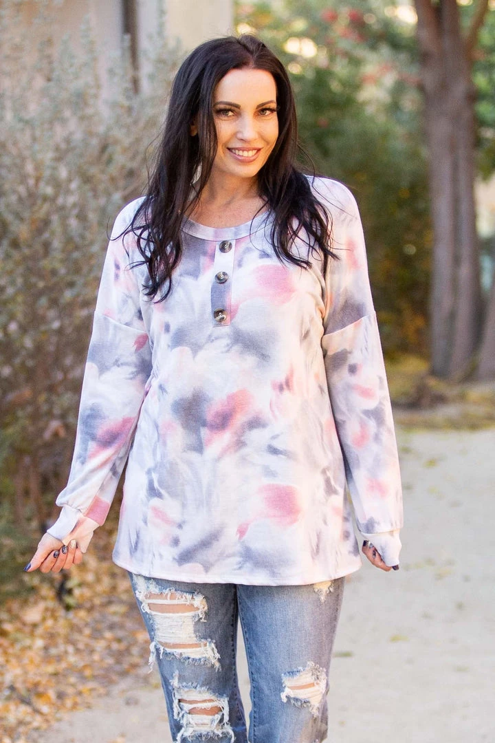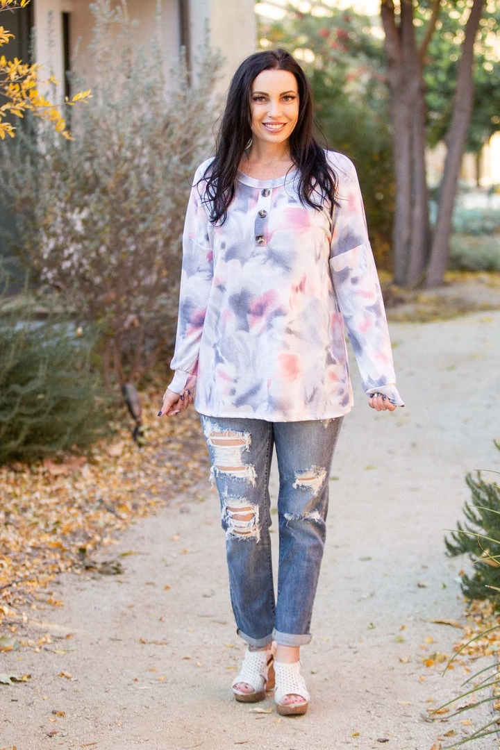 There’s just something so angelic about the colors in this long sleeve top. Featuring long sleeves, a relaxed fit, round neckline with faux buttons, this top will make all your dreams come true.  Â