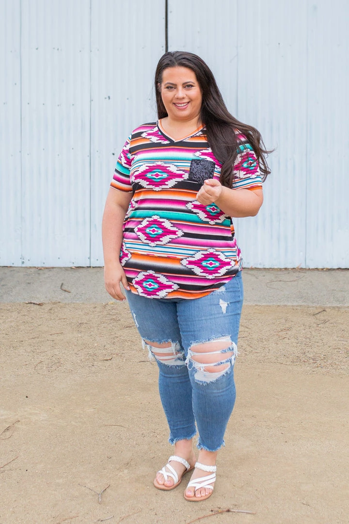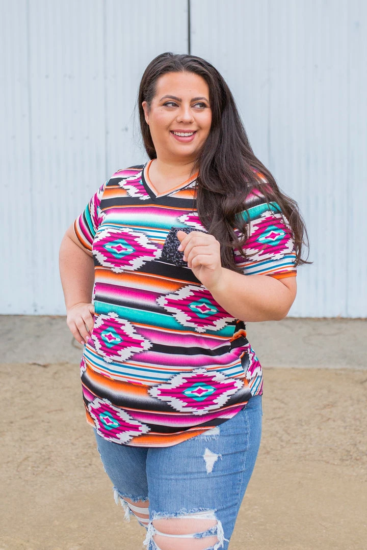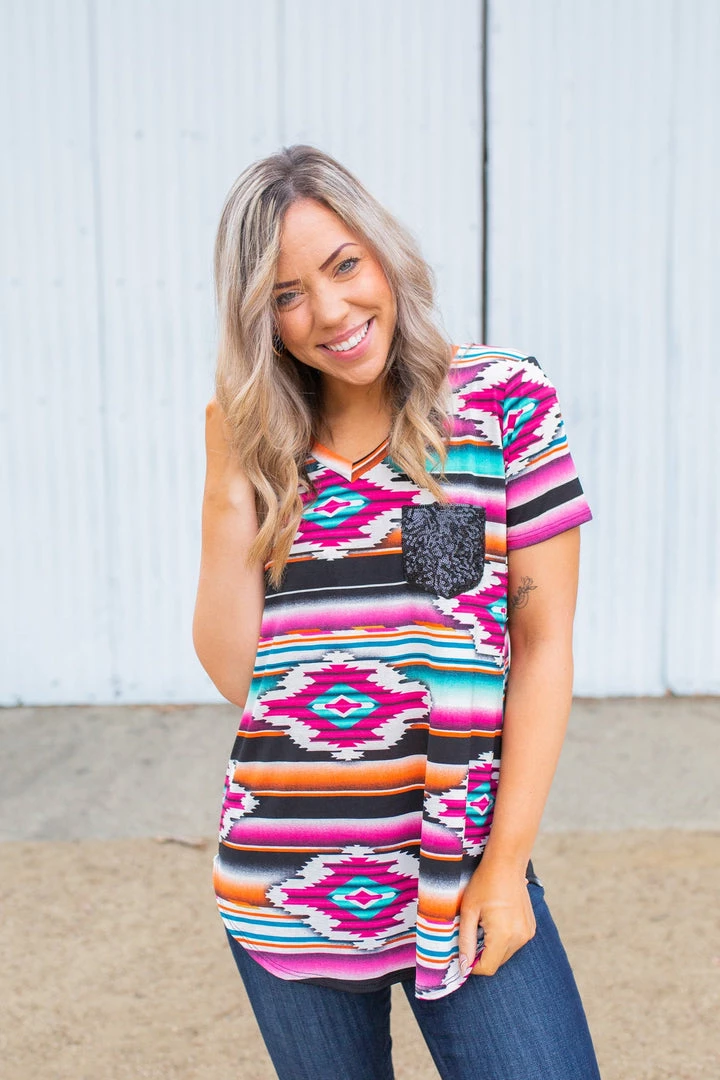 This short sleeve top has the most gorgeous colorways in this southwestern print. With a relaxed fit, this top features a v-neck, rounded hem and sequin front pocket detail.