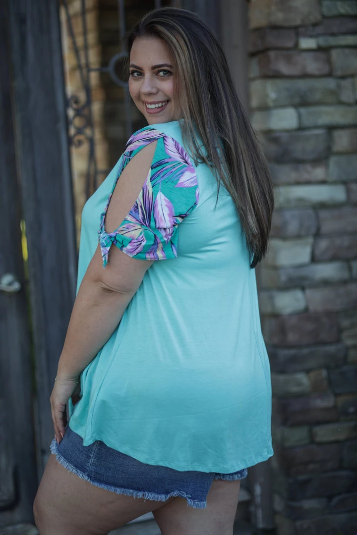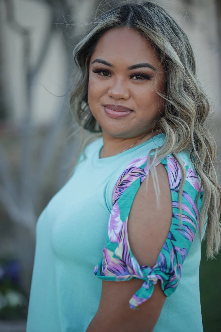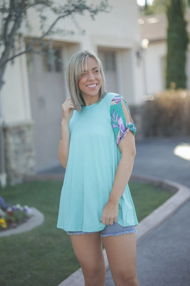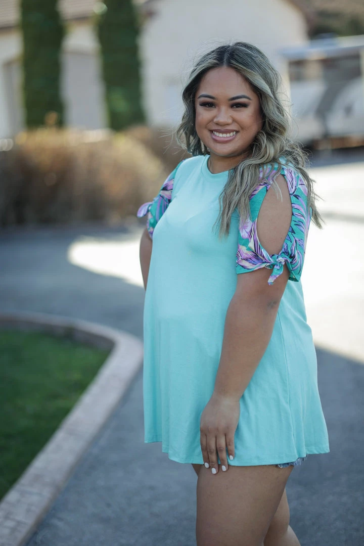 Bring on the joys of summer with this vibrant teal short sleeve top! With a relaxed fit, this top features open tie short sleeves, a round neckline and rounded hem..