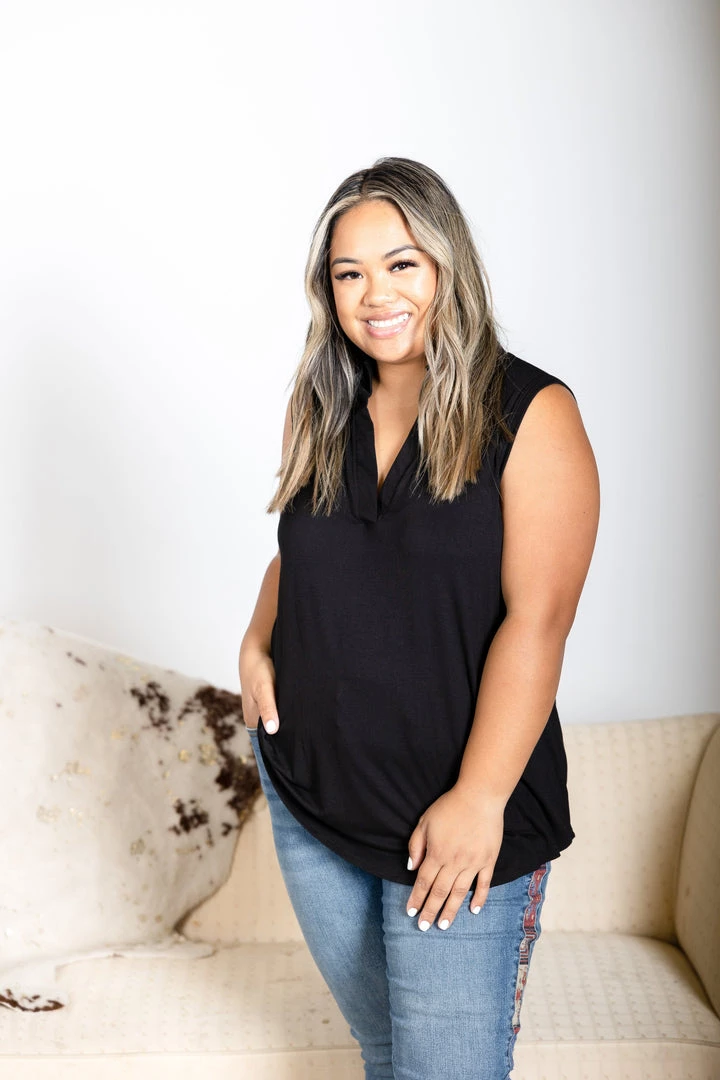 This sleeveless gabby is the perfect everyday wear piece! Wear it on it’s own or layered under your favorite cardigan/jacket. With a relaxed tunic fit, this top features a V-neck with mandarin collar and hi low hem.  Â