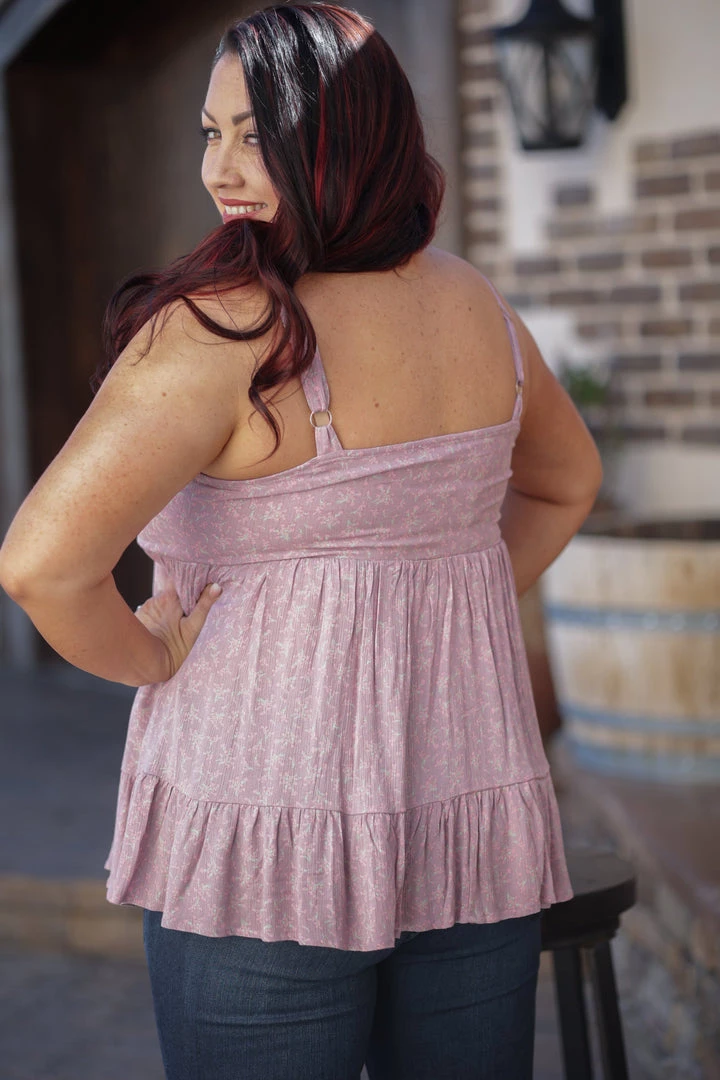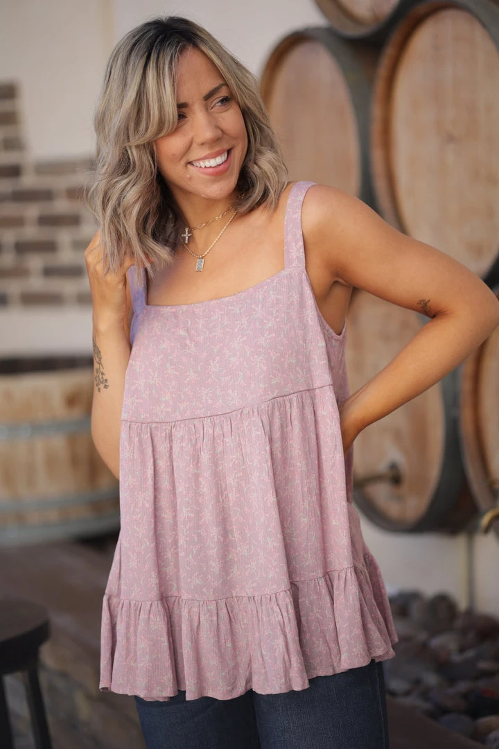 We are swooning over this mauve tiered ruffled tank. Made from a lightweight woven crinkle fabric, this top features a relaxed fit, square neckline, no fuss adjustable shoulder straps and tiered ruffled hem.