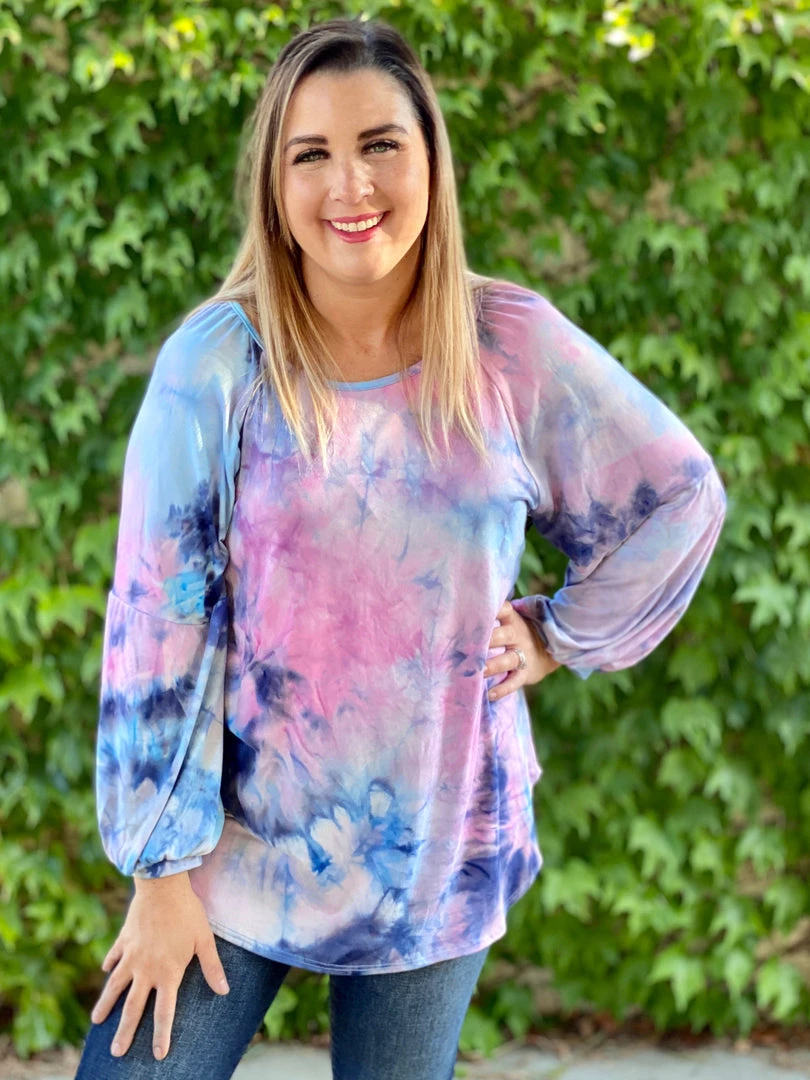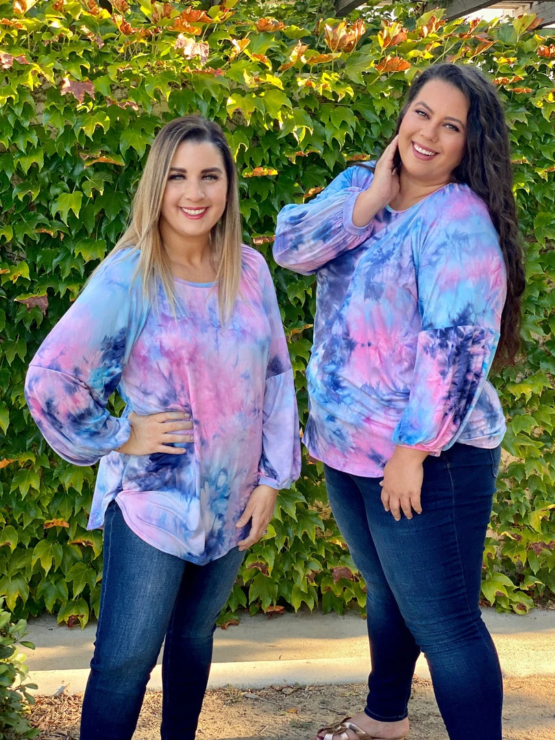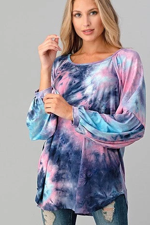 We are absolutely blown away with this gorgeous tie dye printed long sleeve top. The shirred sleeves, round neckline, rounded hem and relaxed fit are nothing far from perfection.