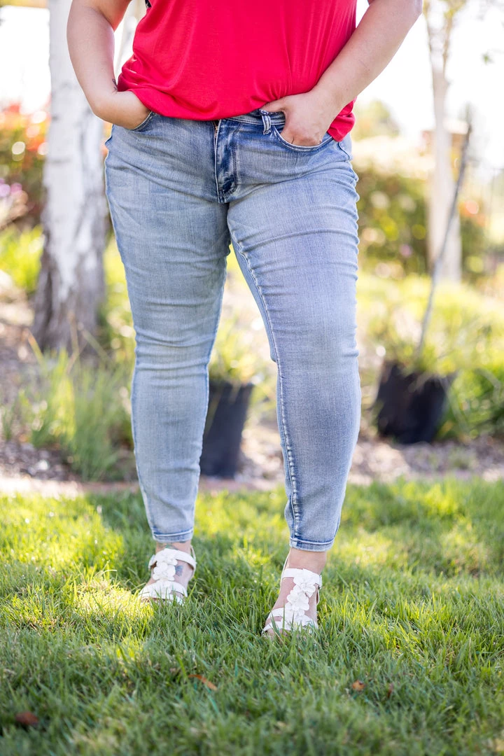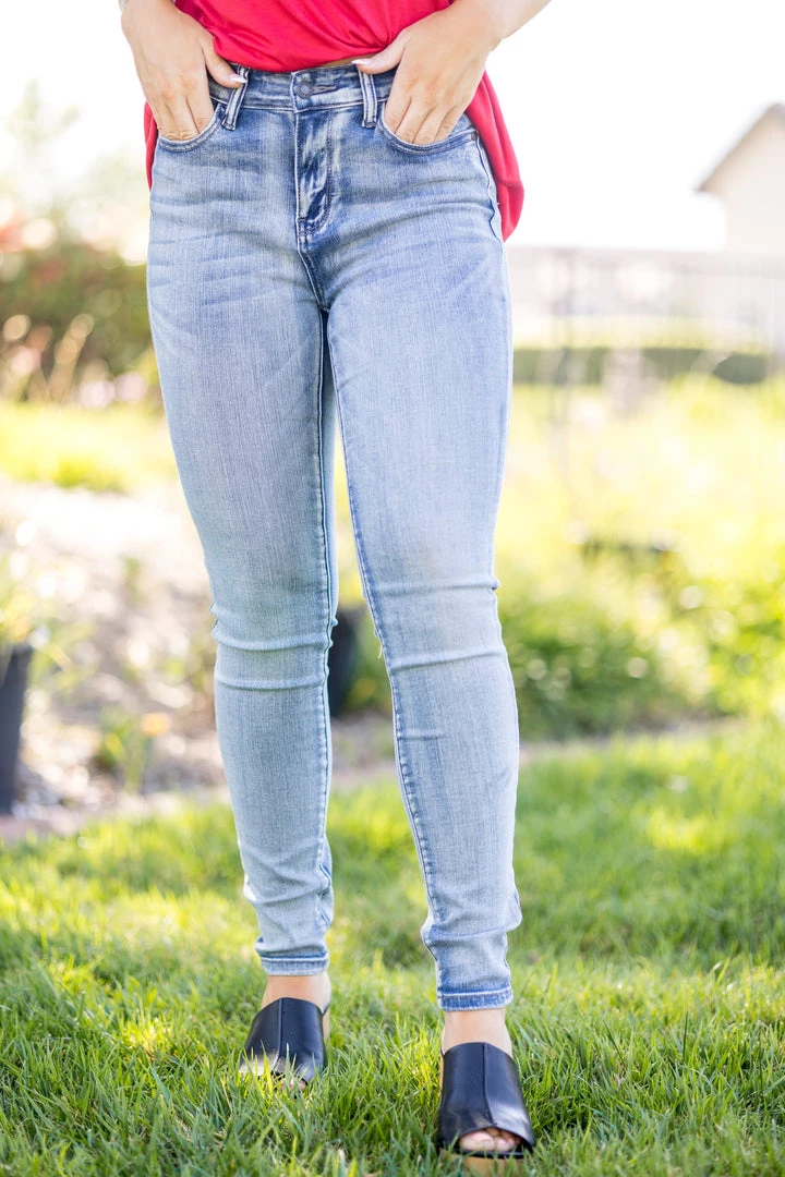 These high rise, non distressed Judy Blue skinnies are not one that you want to pass you by! The heavy sand wash makes them truly unique and of course that stretch is amazing.
