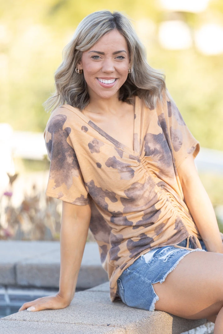 This short sleeve dolman reminds of yummy chocolate chips that just came out of the oven. And the fit is just as decadent as a cookie too. With a relaxed fit, this top features short dolman sleeves , a v-neck and drawstring pull front OR back.  Â
