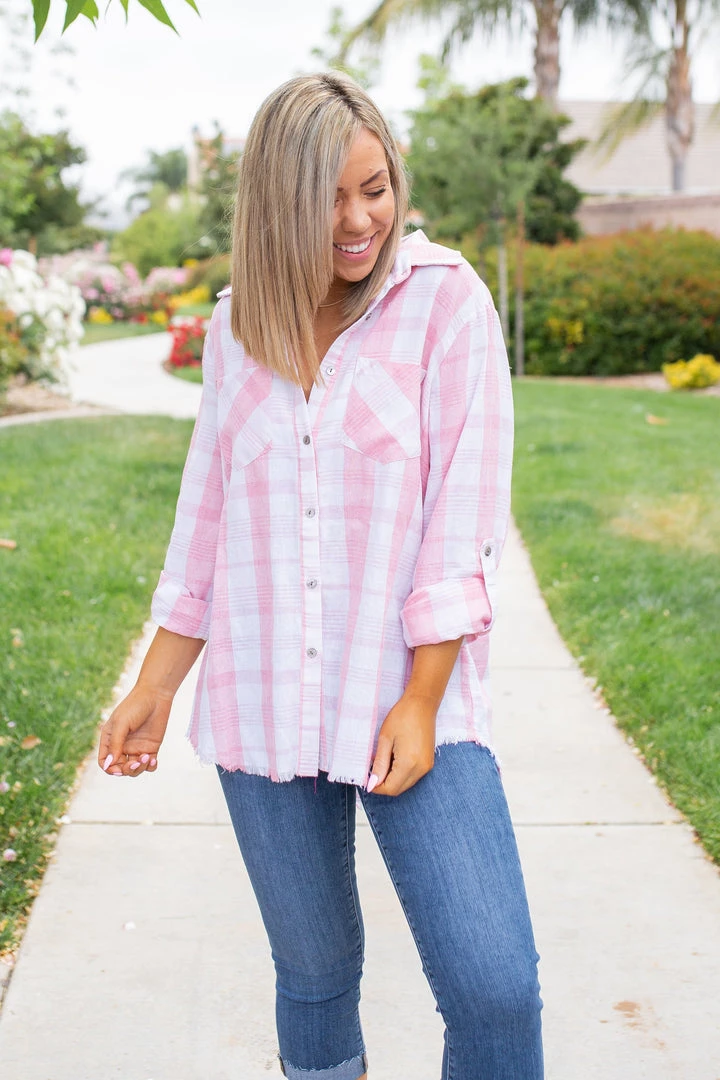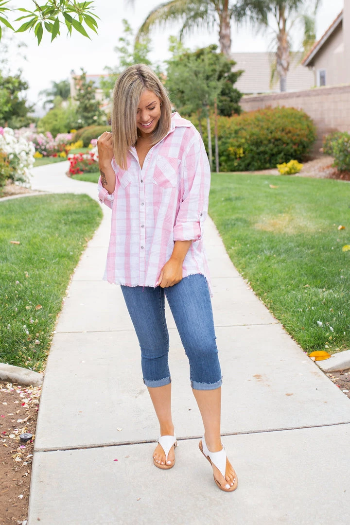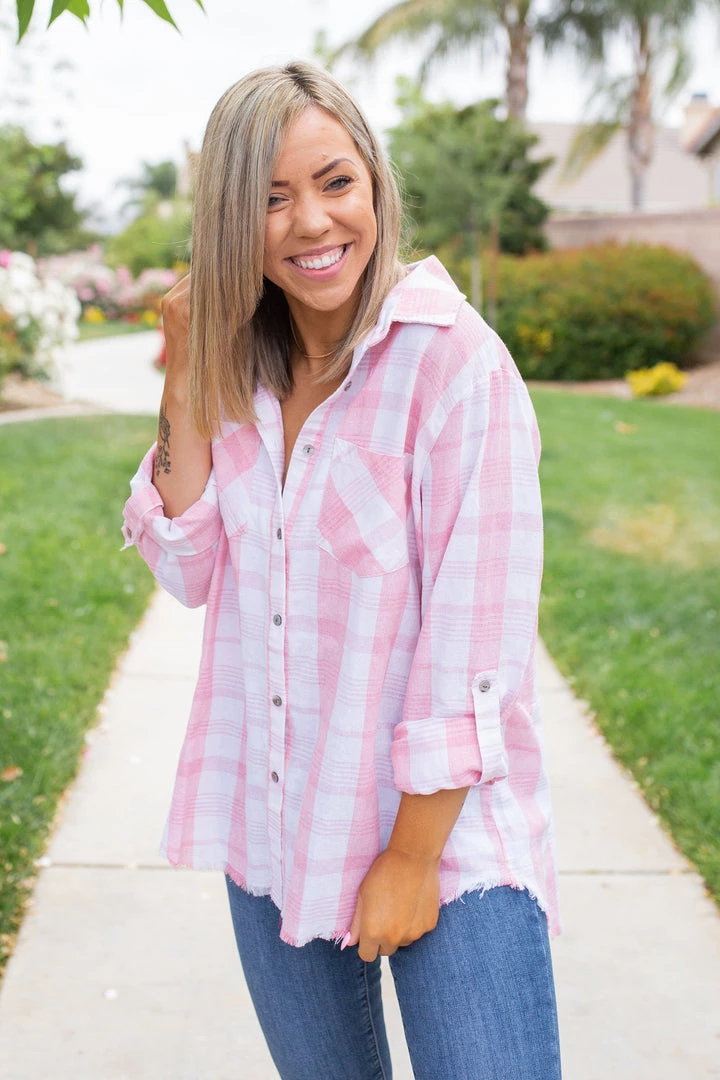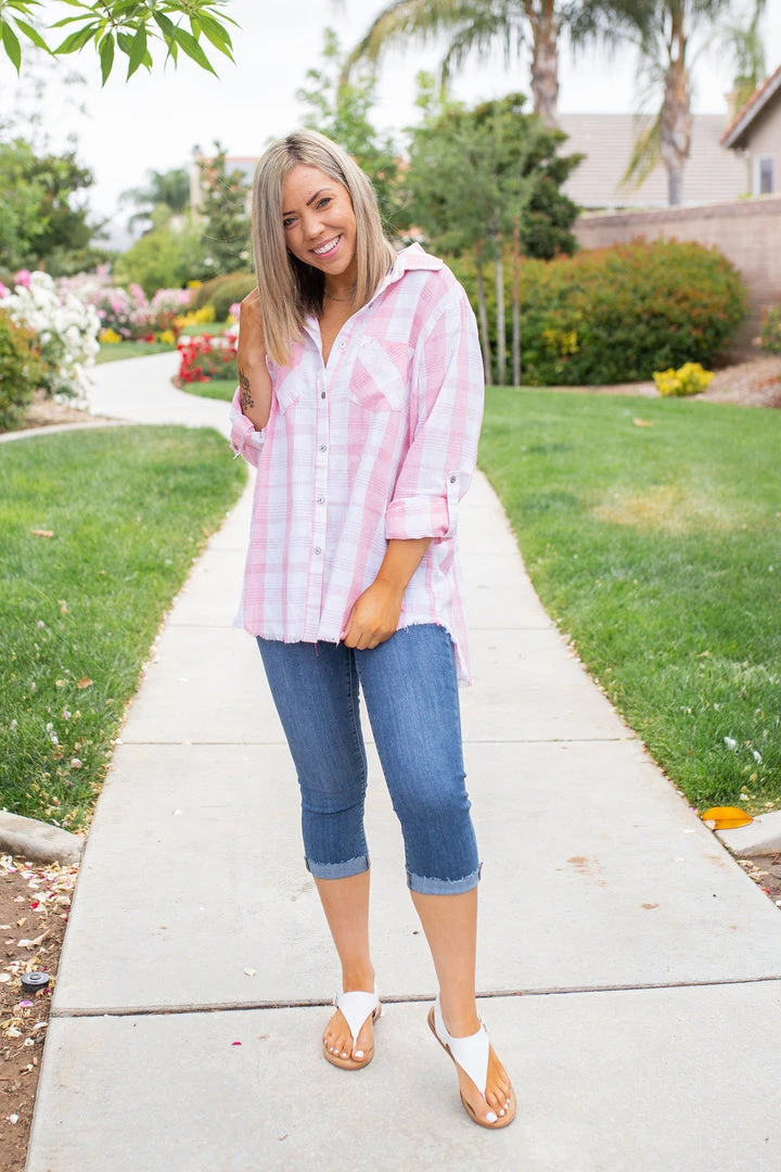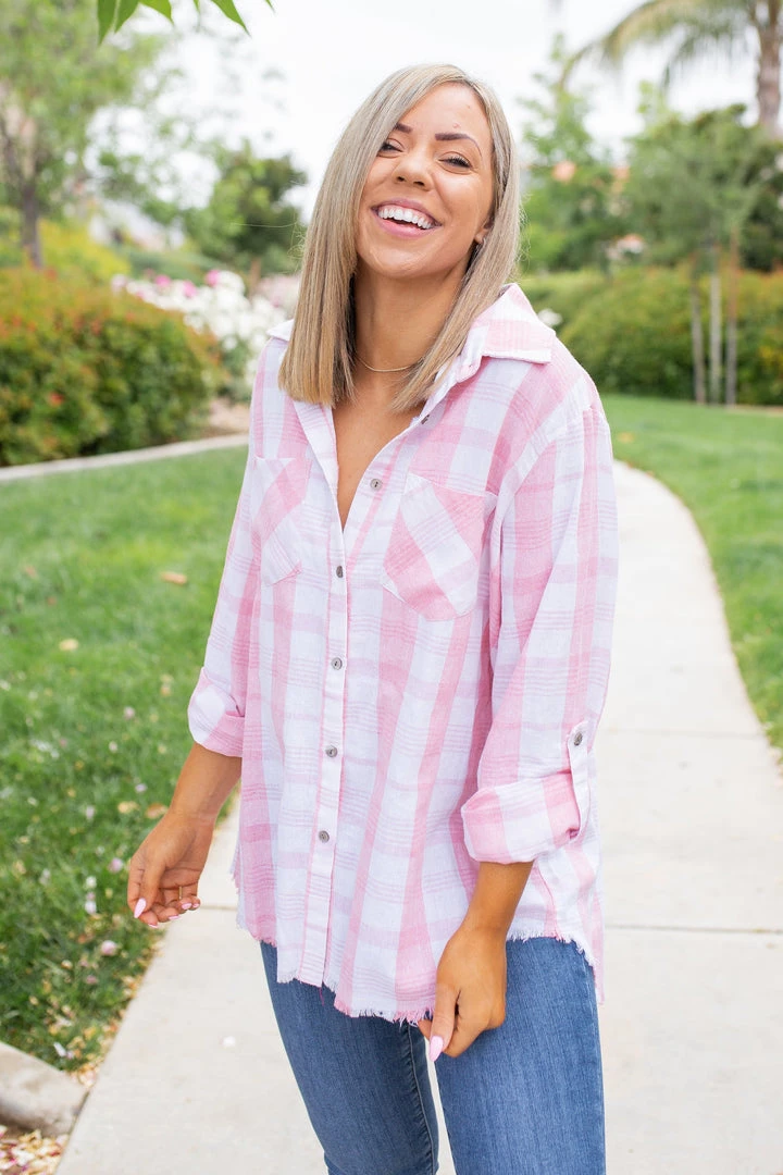 Take me to the fair, because this is what I want to wear while eating cotton candy and listening to music. Wear this top buttoned up, or open over your favorite cami. With a relaxed fit, this top features a collar, front pockets, long sleeves with a button closure to make it a 3/4 sleeve and a frayed hem.  Â