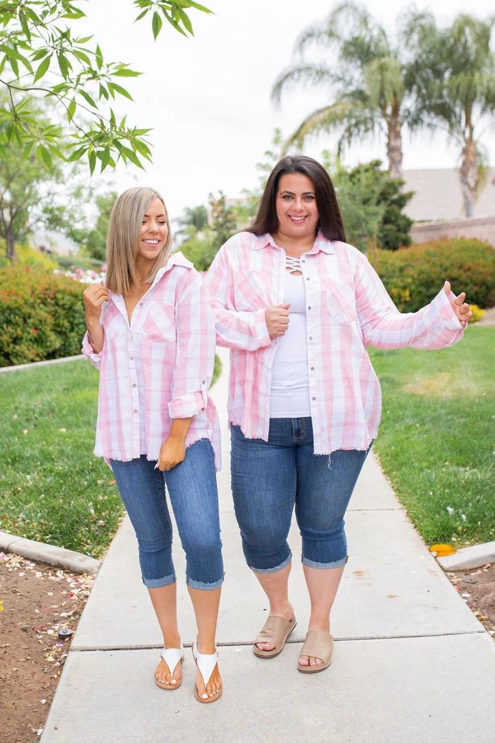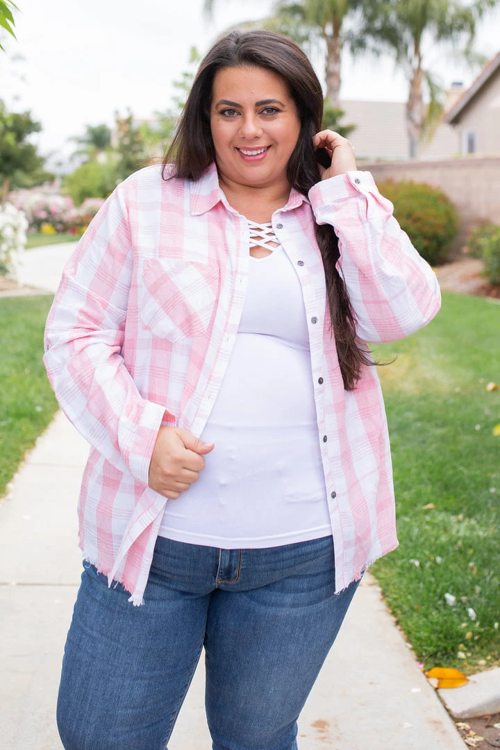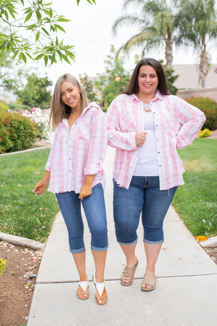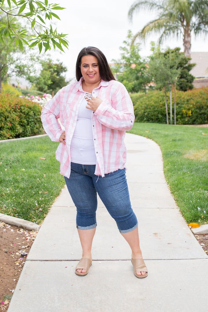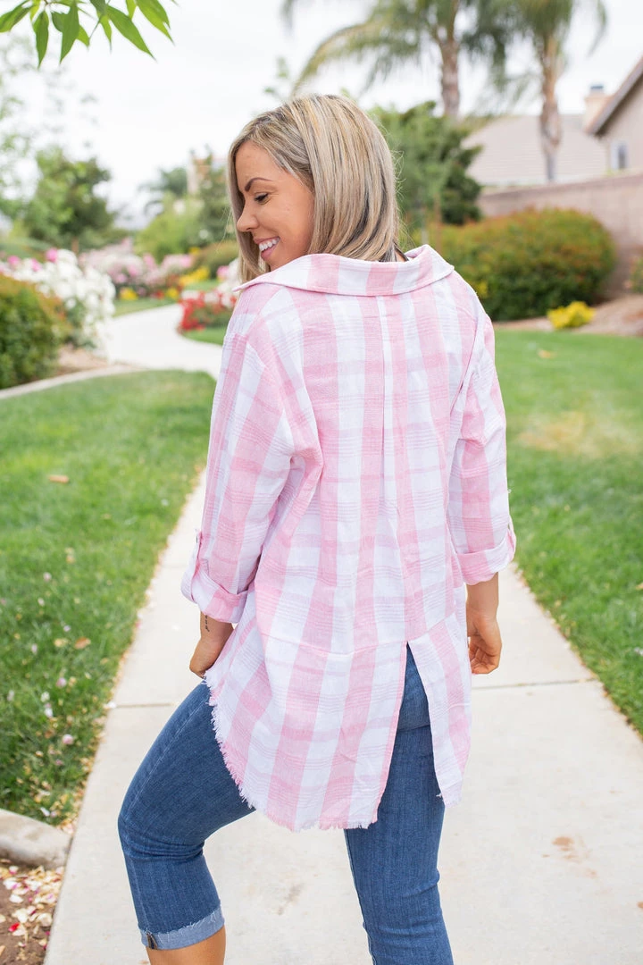 Take me to the fair, because this is what I want to wear while eating cotton candy and listening to music. Wear this top buttoned up, or open over your favorite cami. With a relaxed fit, this top features a collar, front pockets, long sleeves with a button closure to make it a 3/4 sleeve and a frayed hem.  Â