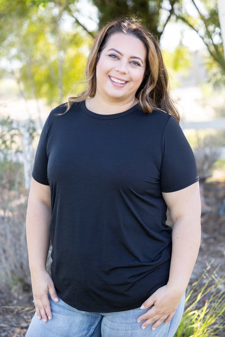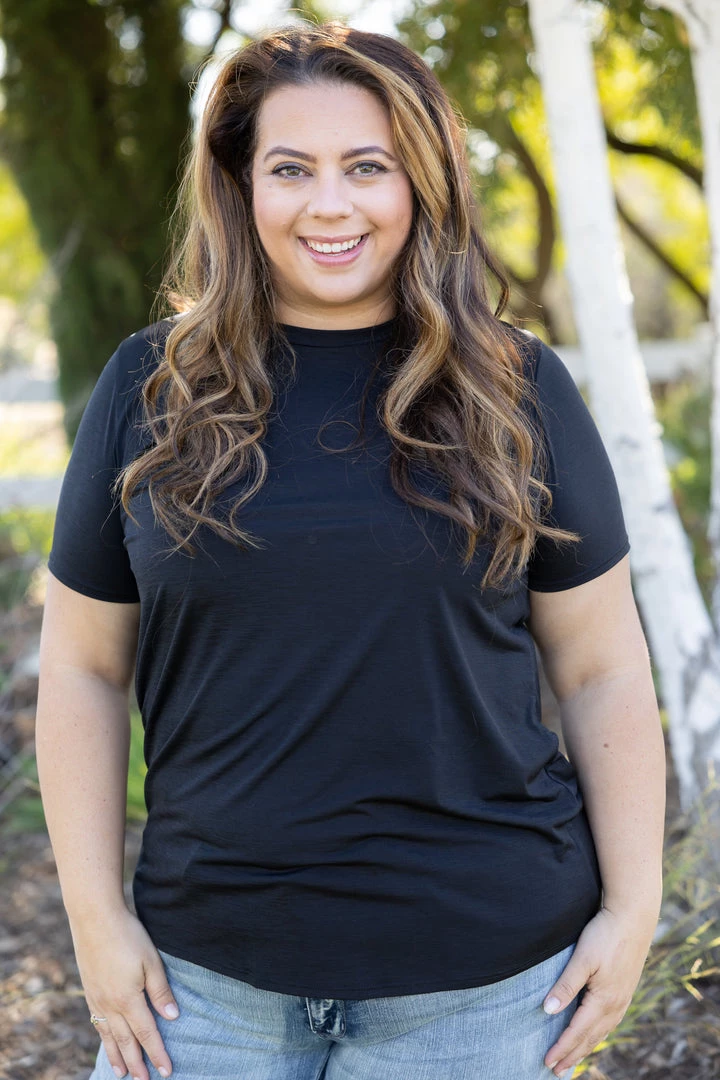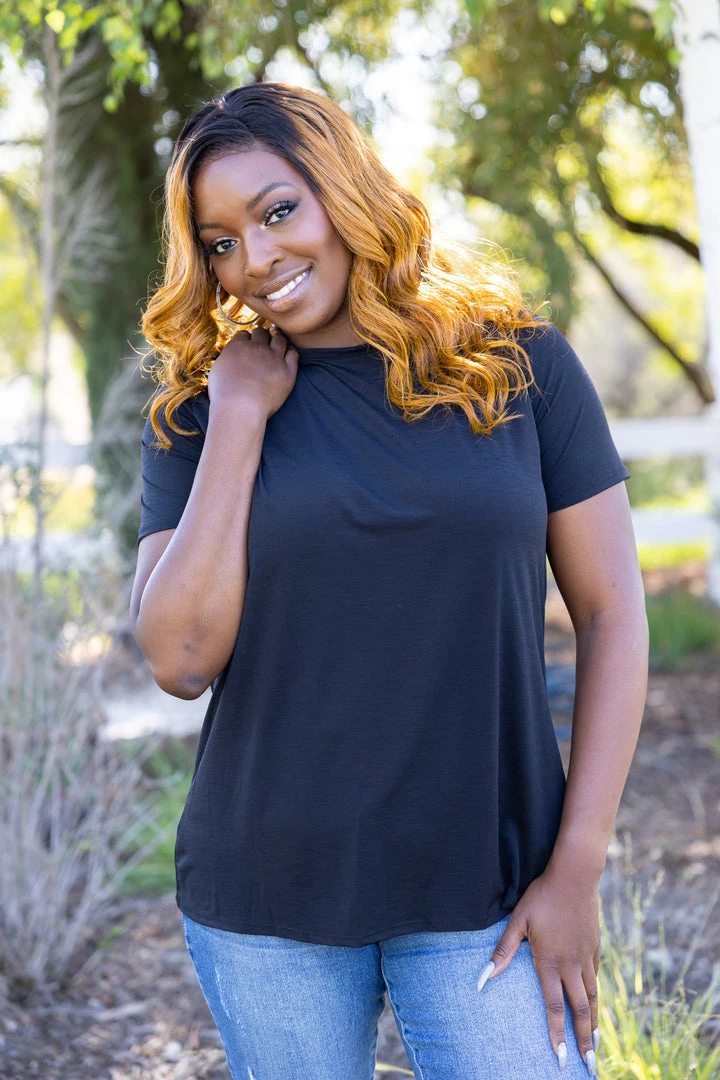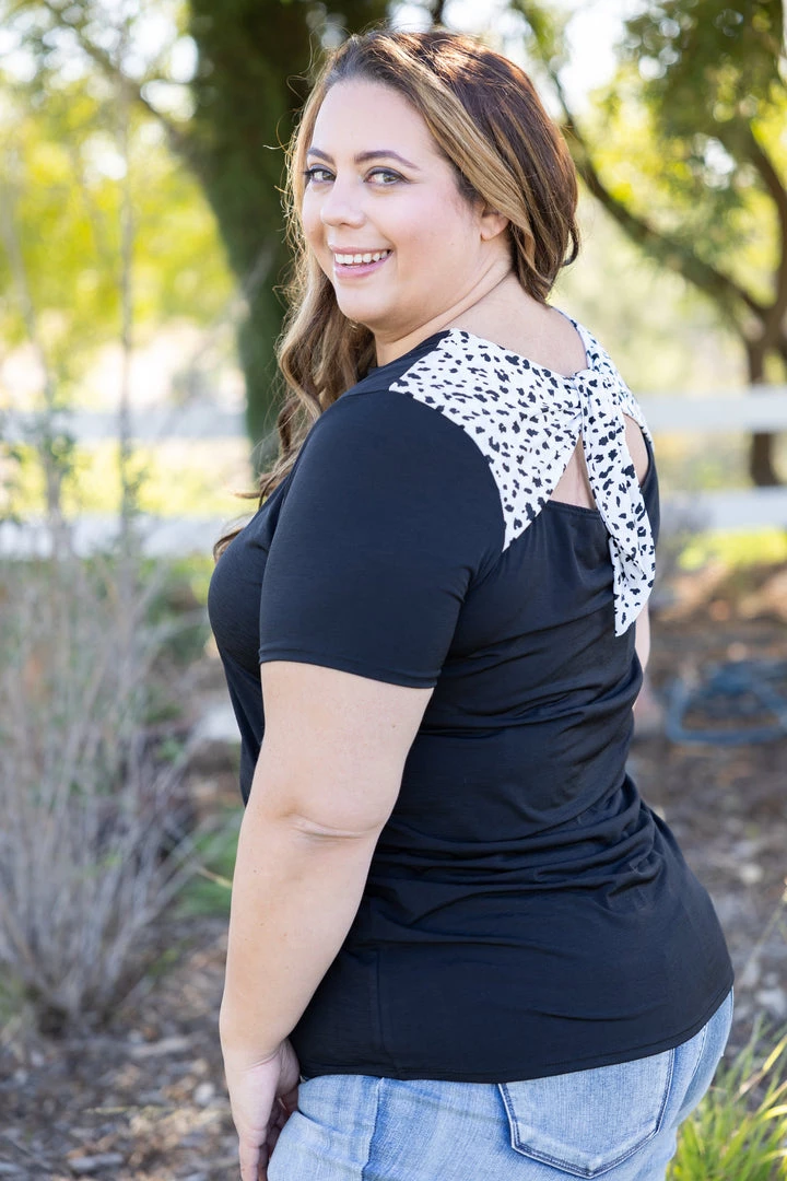 We are loving this fun take on a classic black short sleeve top. The animal print back panel, that self-ties, really gives this piece a unique look. With a relaxed fit, this top features a round neckline, short sleeves and rounded hem.