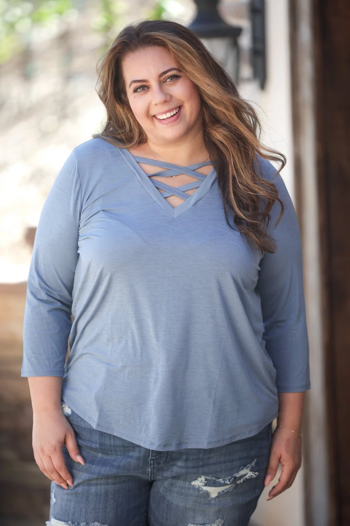 Made from amazing bulgari fabric, this slate blue top will become your next favorite. With a relaxed fit, this top features a v-neck with criss cross details, 3/4 sleeves and hi lo hem.