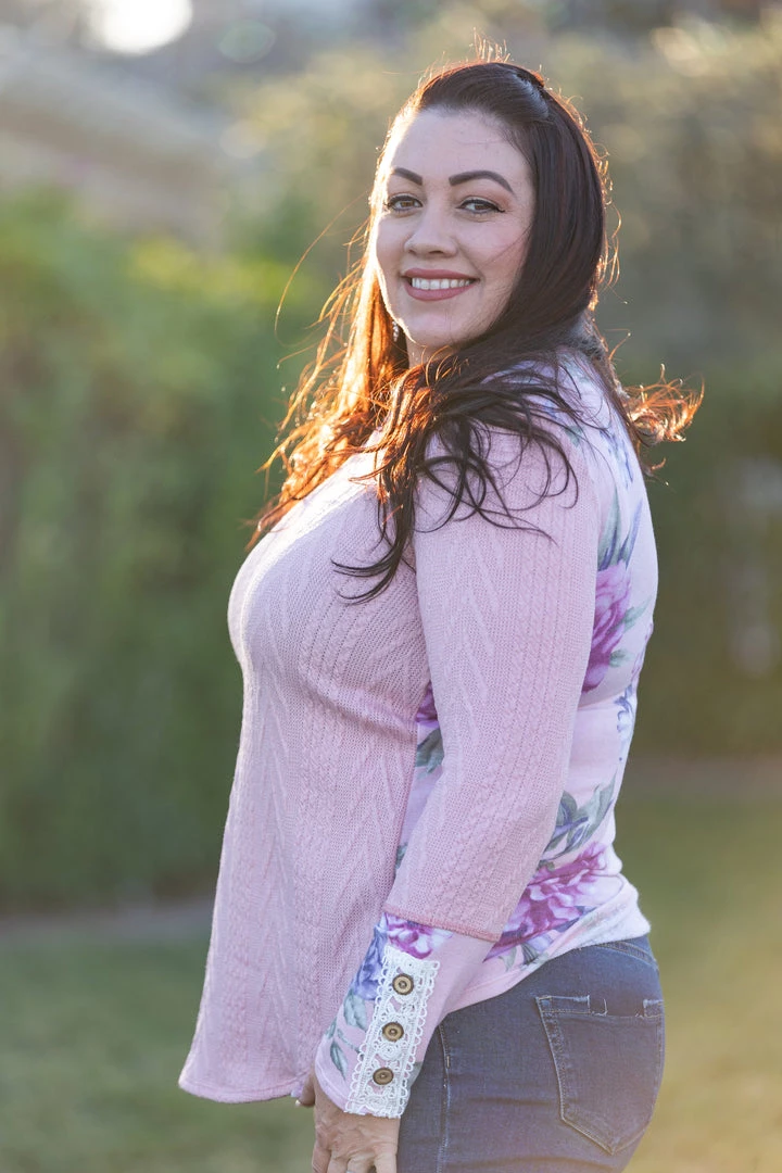 This long sleeve top is THE perfect top to transition into spring with. The color, that floral print, the combination of cable knit and terry, the list can go on and on. With a relaxed fit, this top features a round neckline, long sleeves with floral cuffs and button details, a rounded hem and back floral panel.
