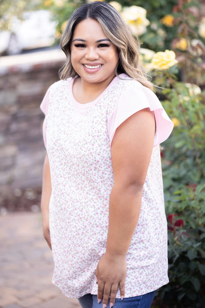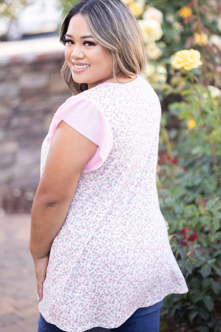 Theres just something so speacial about those small floral prints that have us swooning. This top features a round neckline, short ruffled sleeves, a rounded hem and reverse stitch detailing.