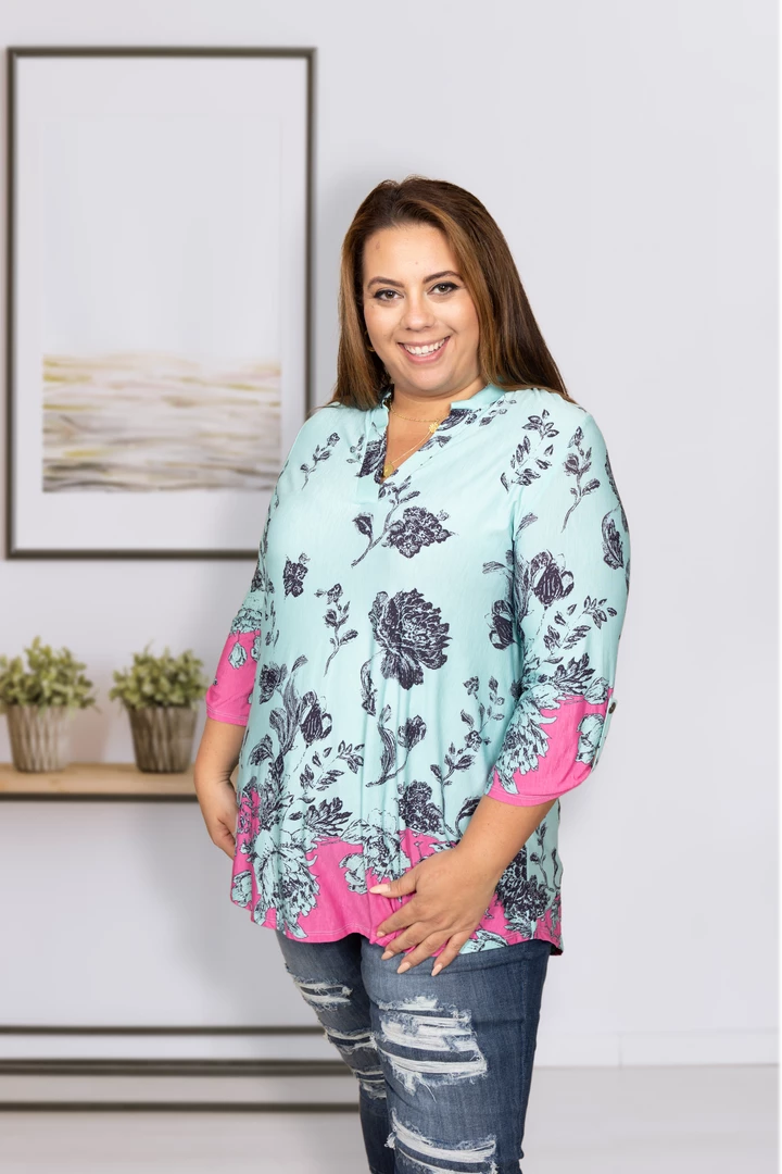 This 3/4 sleeve gabby was dipped like a dream. That mint floral body with the bright pink trims has us swooning. With a relaxed tunic fit, this top features a v-neck with mandarin collar, 3/4 sleeves with button detail and hi low hem.