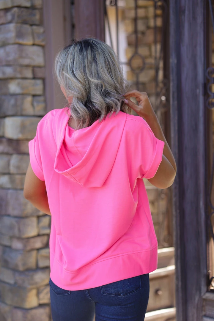 No one will ever be able to forget you in this vibrant hot pink short sleeve hoodie. SO perfect to welcome that warm weather in. Made from a soft terry fabric, this hoodie features, a v-neck with shoelace details, short cuffed sleeves, hood and rounded hem.