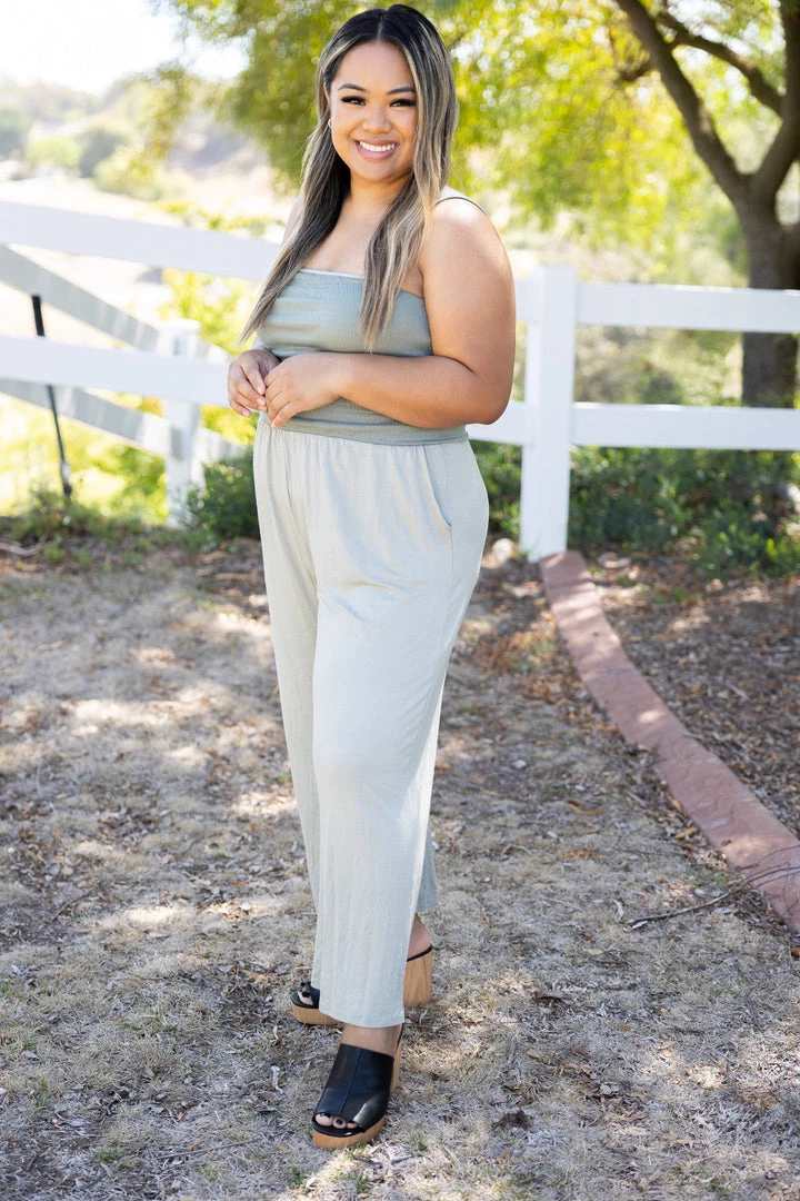 You will never want another jumper after this one, it is absolute perfection. The dusty sage color is the perfect shade of green. Featuring a smocked bodice and wide legs give such a flattering look on all and side pockets! Â