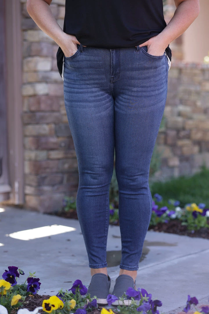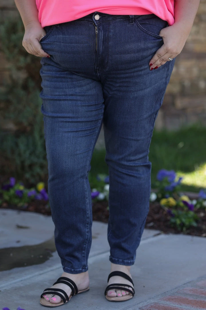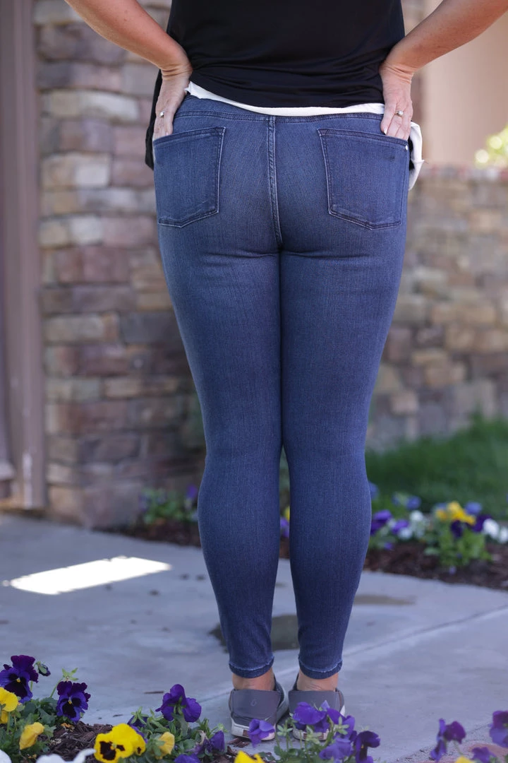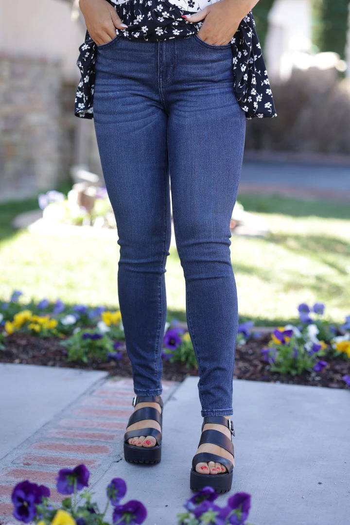 There’s nothing basic about this these classic dark wash Judy Blue Skinnies…they’re extraordinary! This non distressed pair of Judy Blues carries that classic stretch that hold it’s shape all day long.Â