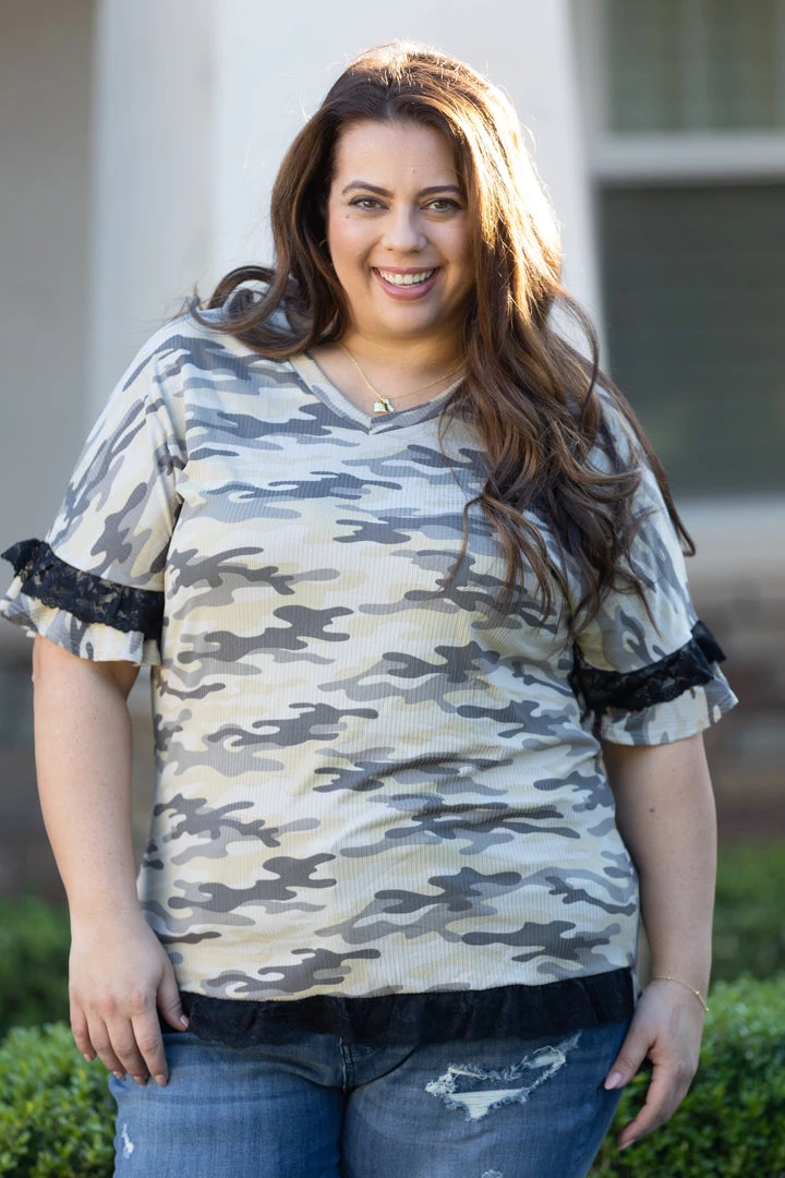 Say hello to the most amazing lace trim top you will find this season. Made from a micro ribbed fabric, this top features a v-neck, short ruffle sleeves with lace trim and a hi lo hem…also with a lace trim! Â