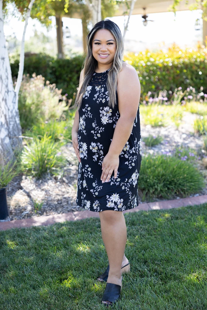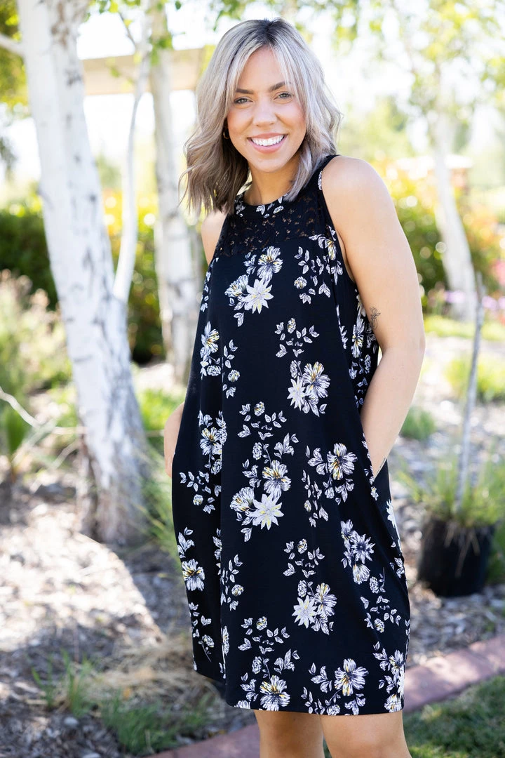 Classy and fun, this floral printed dress is absolutely stunning. With a relaxed fit, this dress features a round neckline with lace trim and side pockets.
