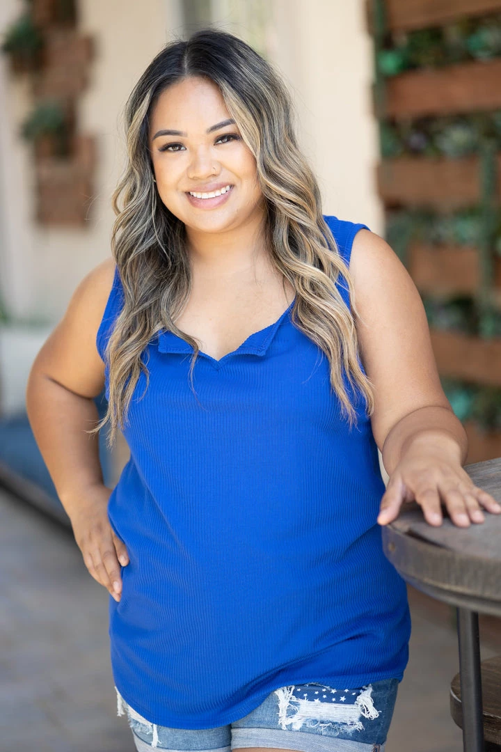 This slightly ribbed sleeveless top is the perfect piece to wear alone or layered under your favorite blazer. With a relaxed fit this top features a square neckline with notched cutout and rounded hem.