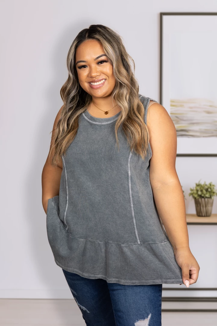 This mineral washed mini waffle knit peplum tank is the perfect shade of charcoal. With a relaxed fit this top features a round neckline, ruffled hem and reverse stitching details.