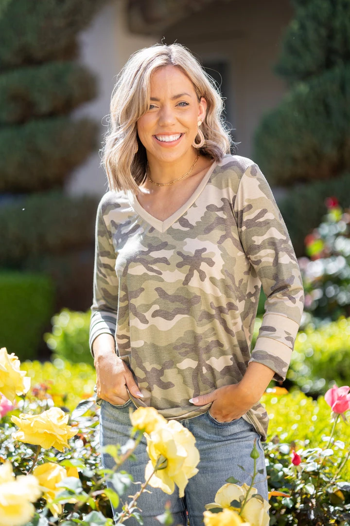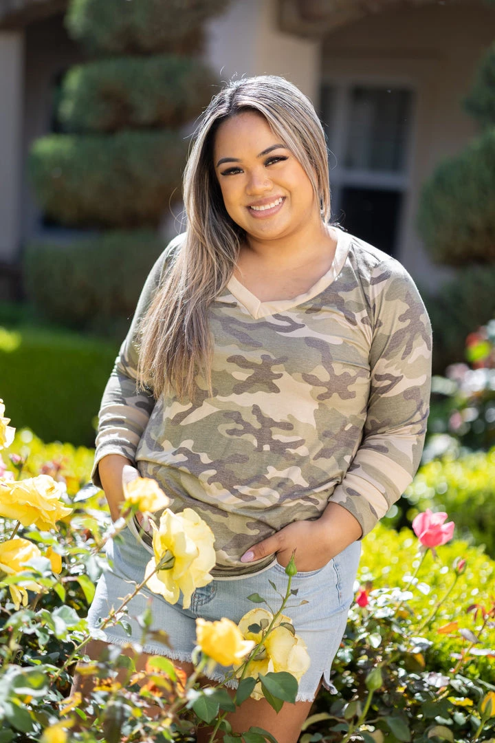 We are loving this fun camo 3/4 sleeve top. Made from the softest jersey fabric, this top features a v-neck, striped cuffs and rounded hem. Â