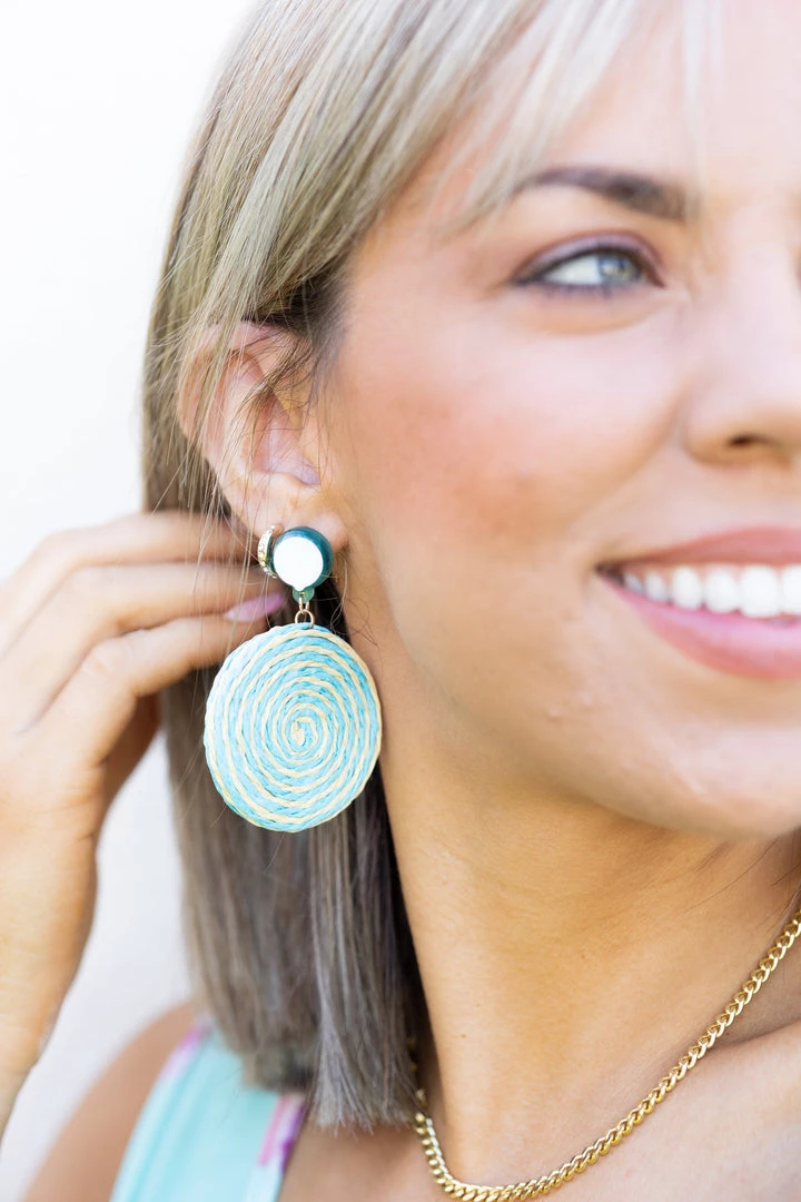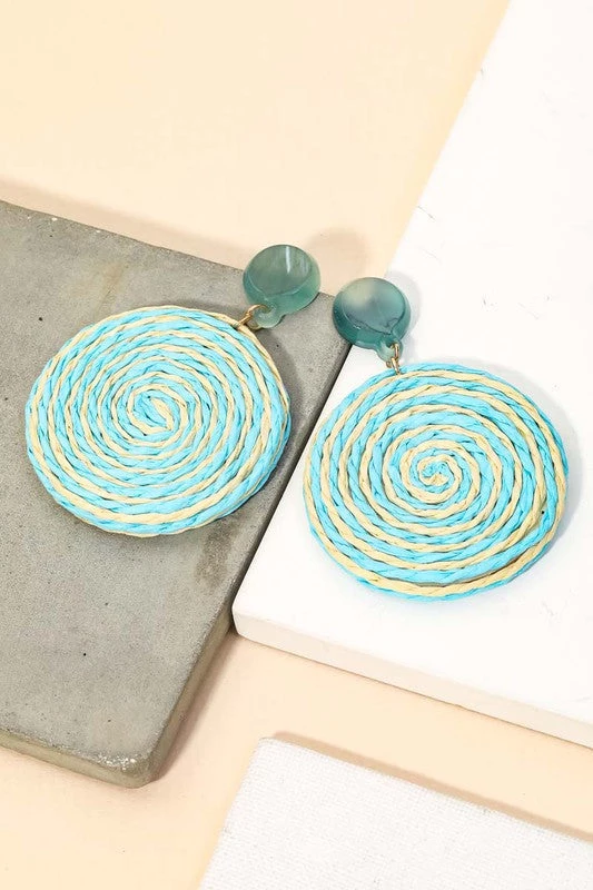 A popular trending pair of drop earrings features a gorgeous straw spiral braided disc drop earrings design. This is a gorgeous chic accessory that everyone will want!