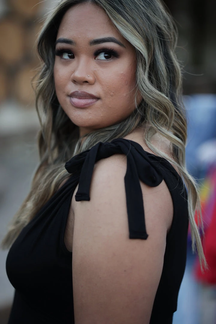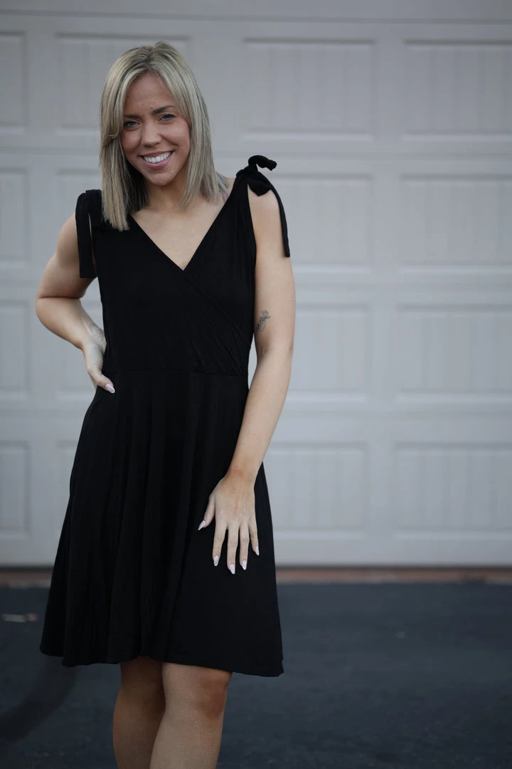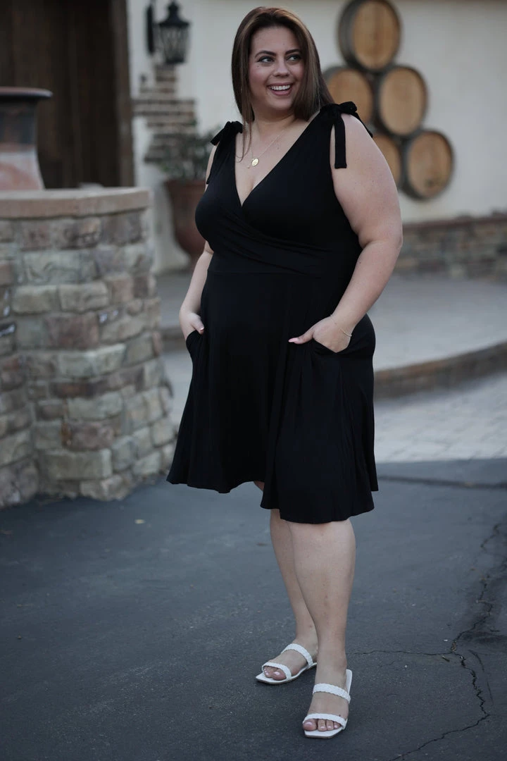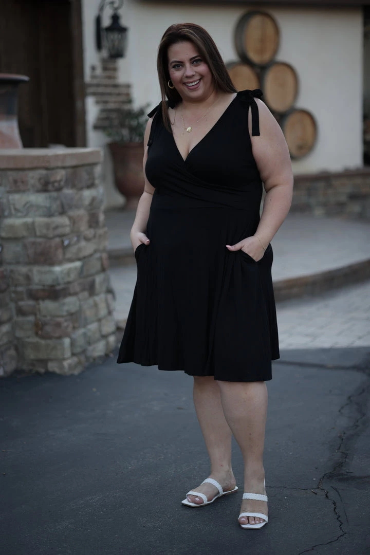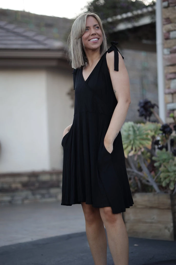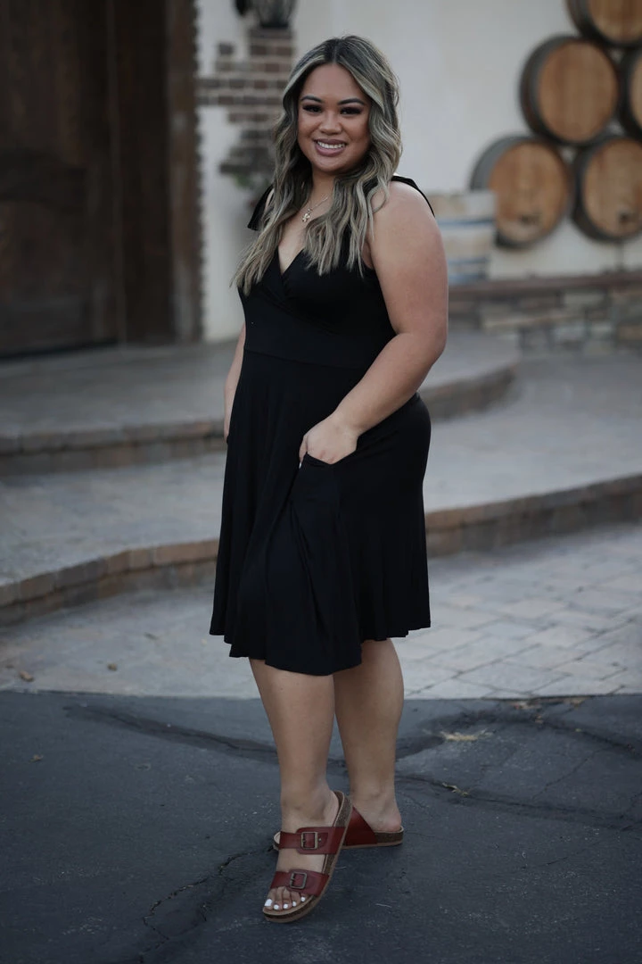 Isn’t she lovely, isn’t she wonderful? This solid jersey knit dress is absoutely perfect for each and every occasion under the sun. With a suprplice front, this dress features adjustable ties (perfect for every pody type) and pockets!