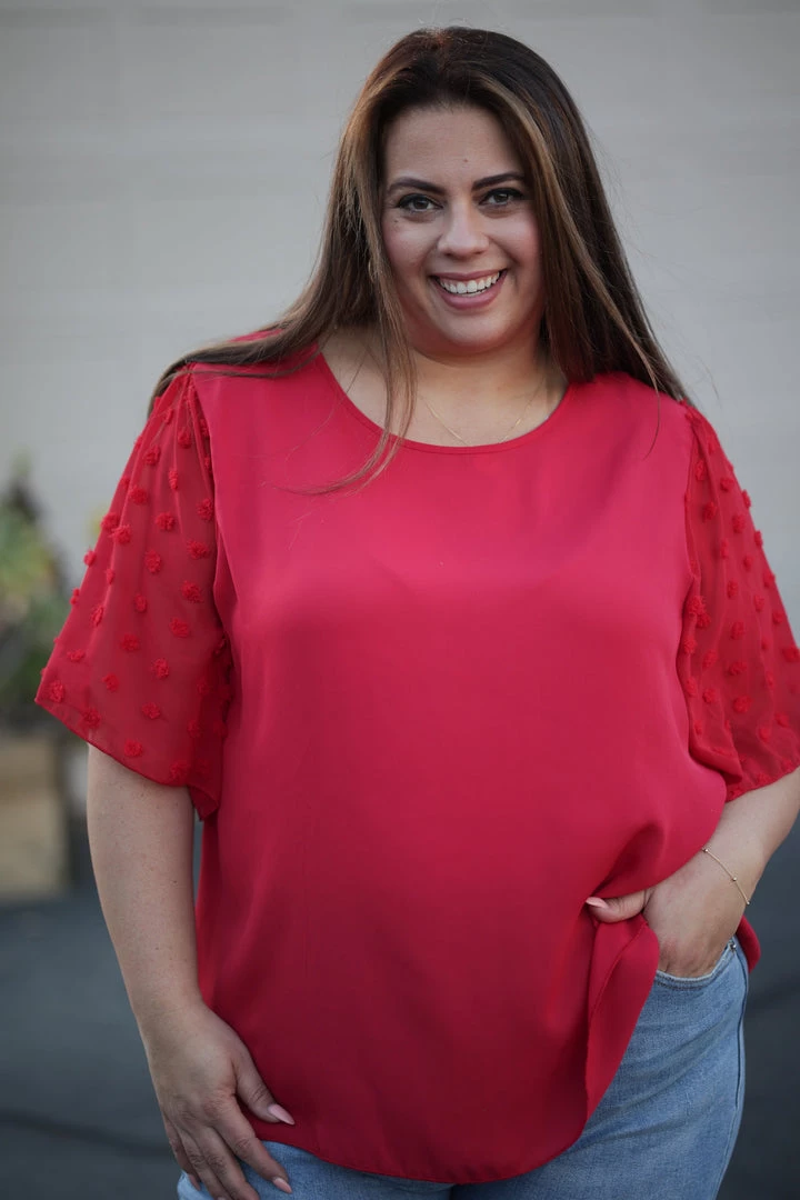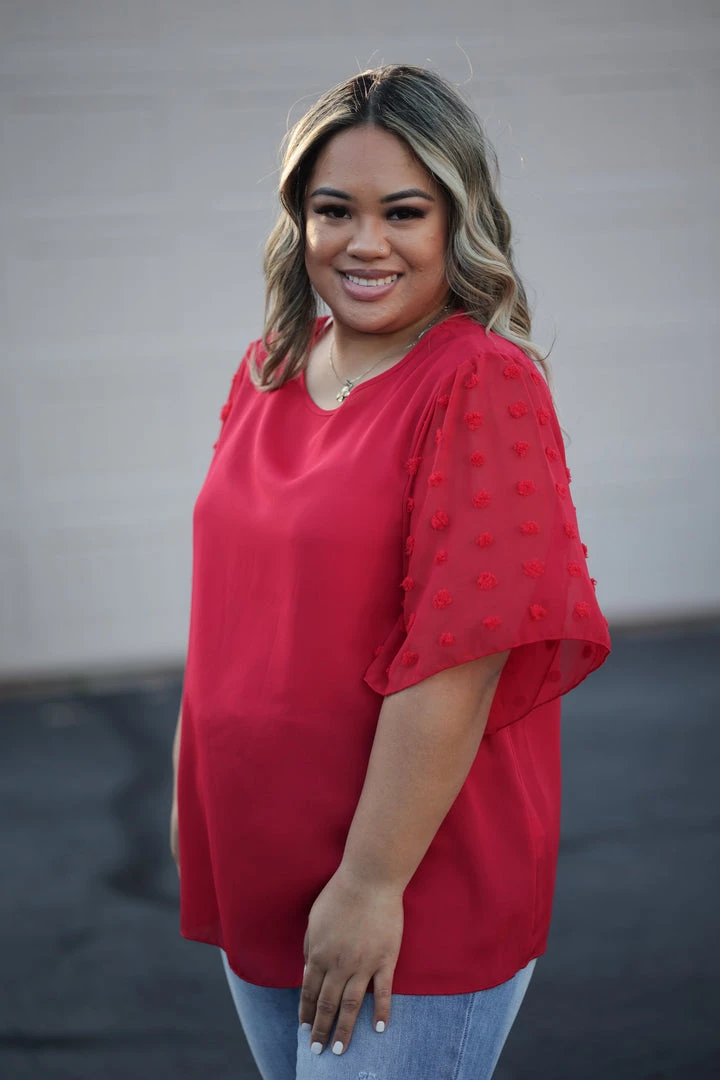 This true red woven blouse is the perfect piece to dress up or down with. With a relaxed fit, this top features a round neckline, sheer bell sleeves with mini popcorn detailing and a rounded hem.