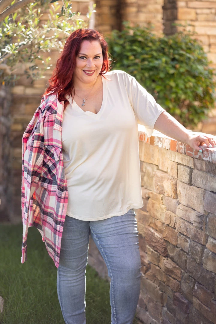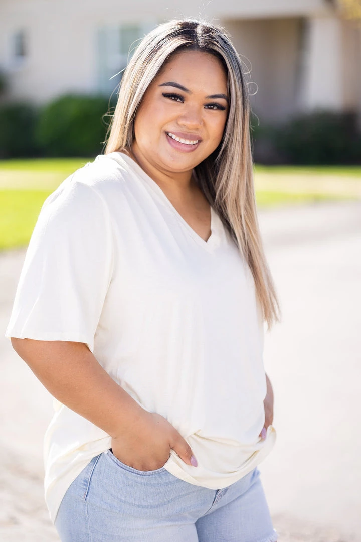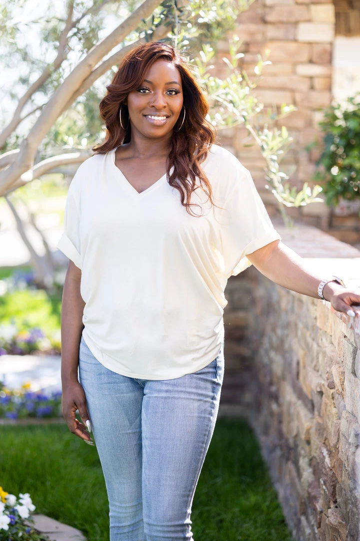 This short sleeve basic top is perfect for those dreamers out there. Made from the softest material, this top features a relaxed fit, v-neck and short sleeves. Â