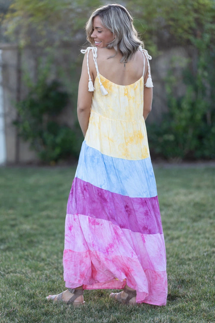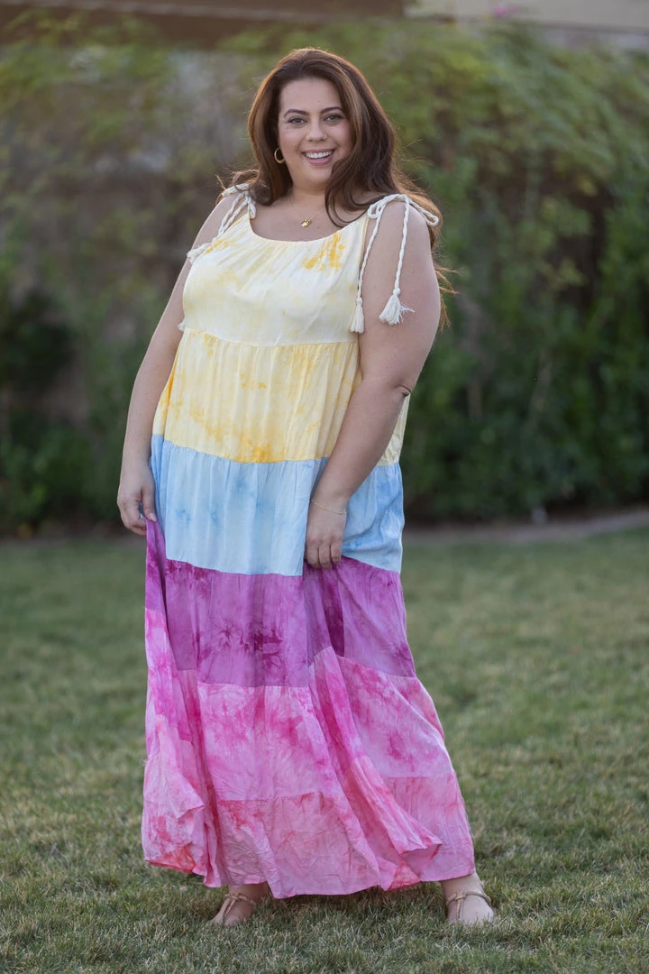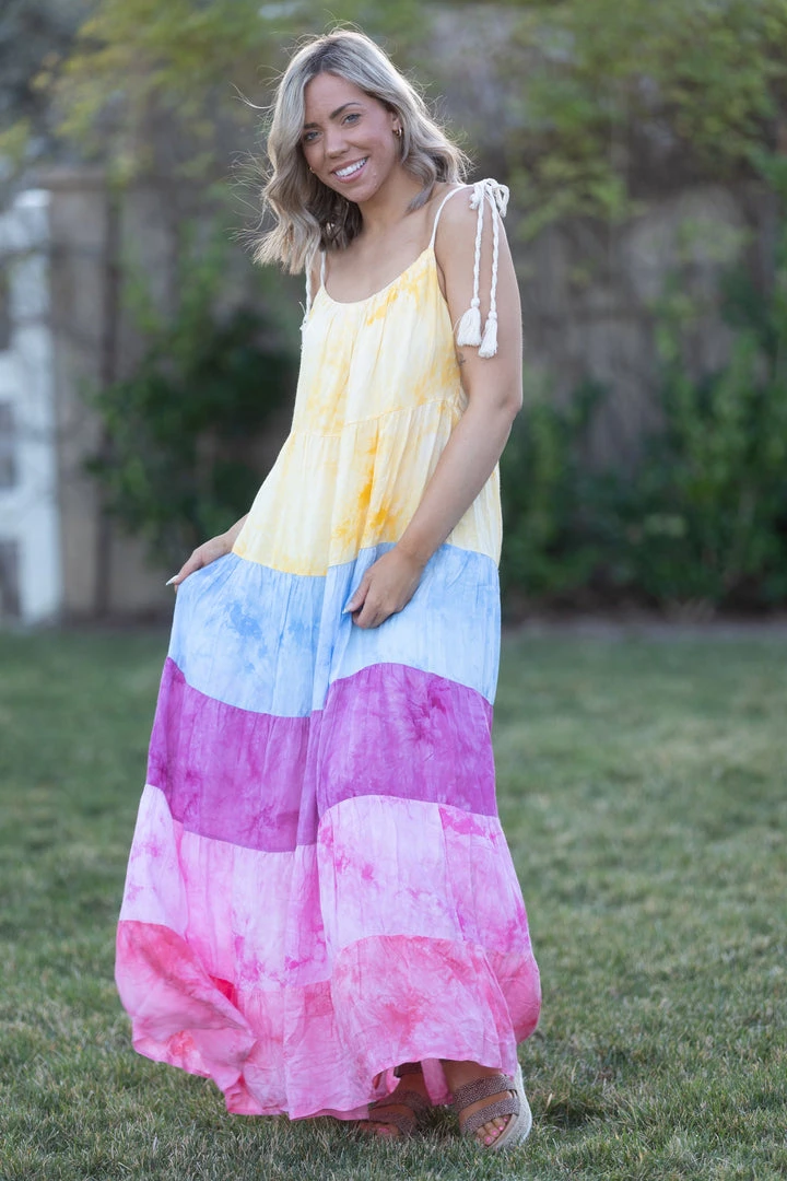 We are head over heels for this tiered tie dye maxi. Warmer days, here we come! With a relaxed fit, this dress features a square neckline and tiered tie dye colorblocking with a hi – lo hem.