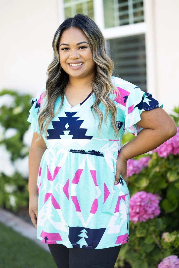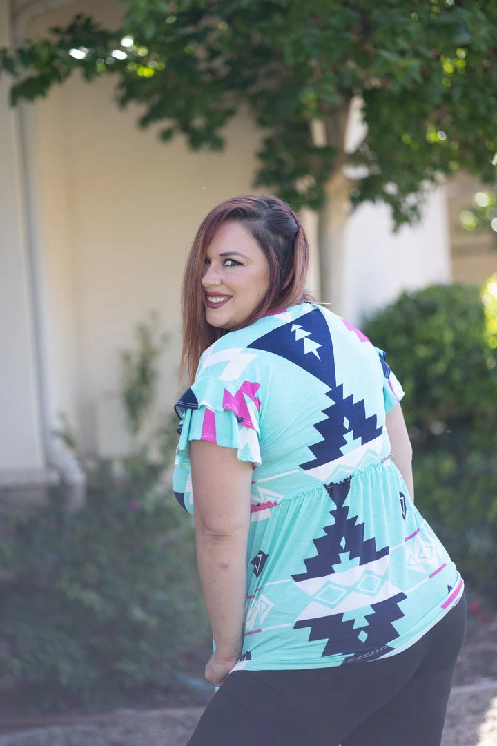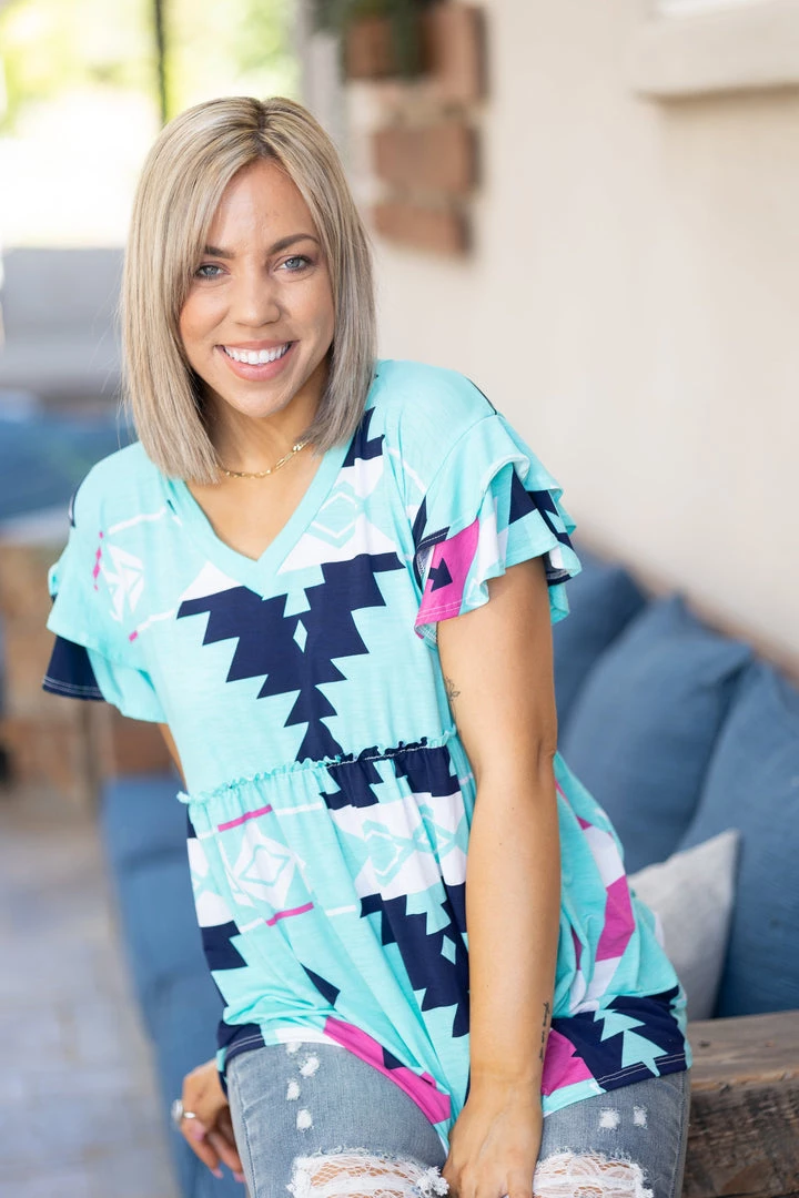 This short sleeve babydoll is the perfect shade of mint and the Aztec print really makes for such a unique piece. With a relaxed fit, this top features a V-neck, short sleeves and ruffled peplum hem.