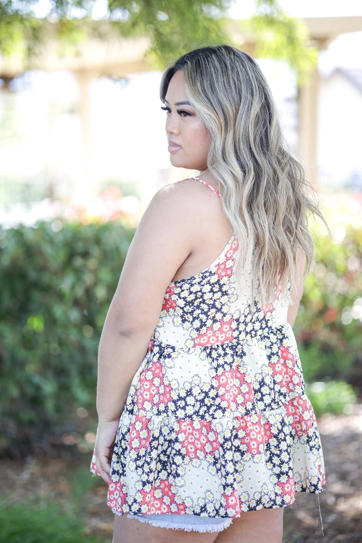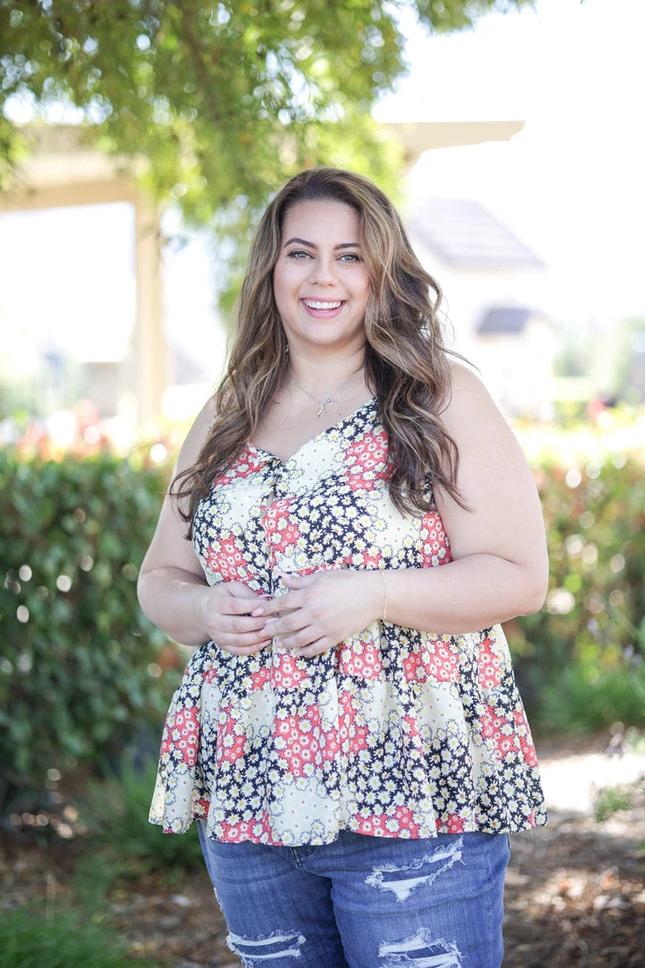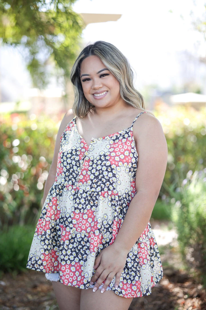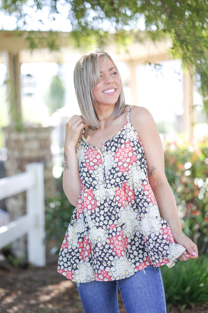 This woven cami tank is perfect for just about any occasion. With a relaxed fit, this top features a v-neck, button down details, spaghetti straps and double ruffle bottom.