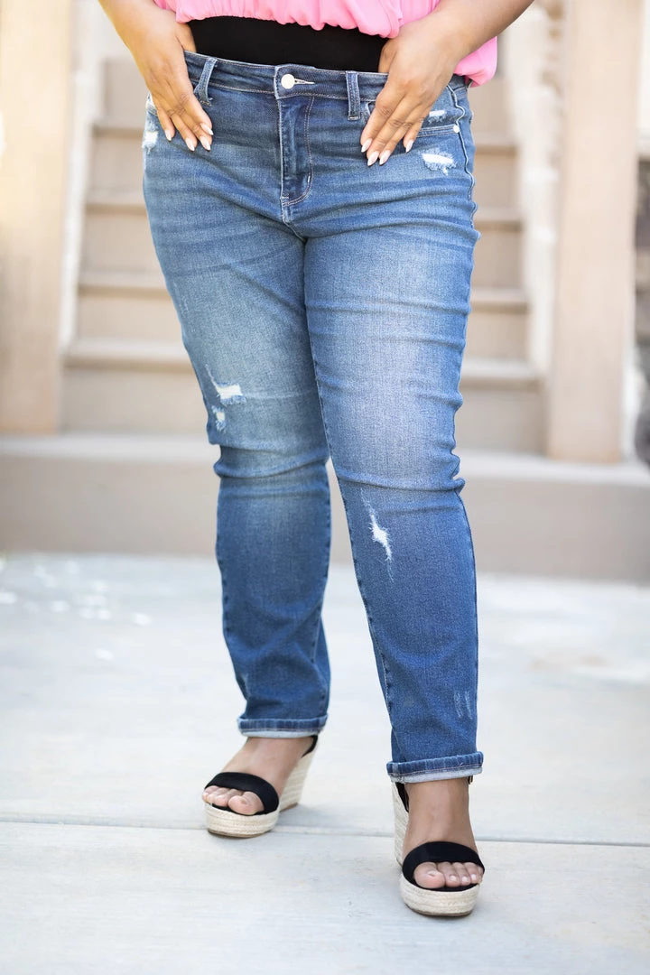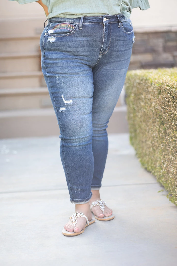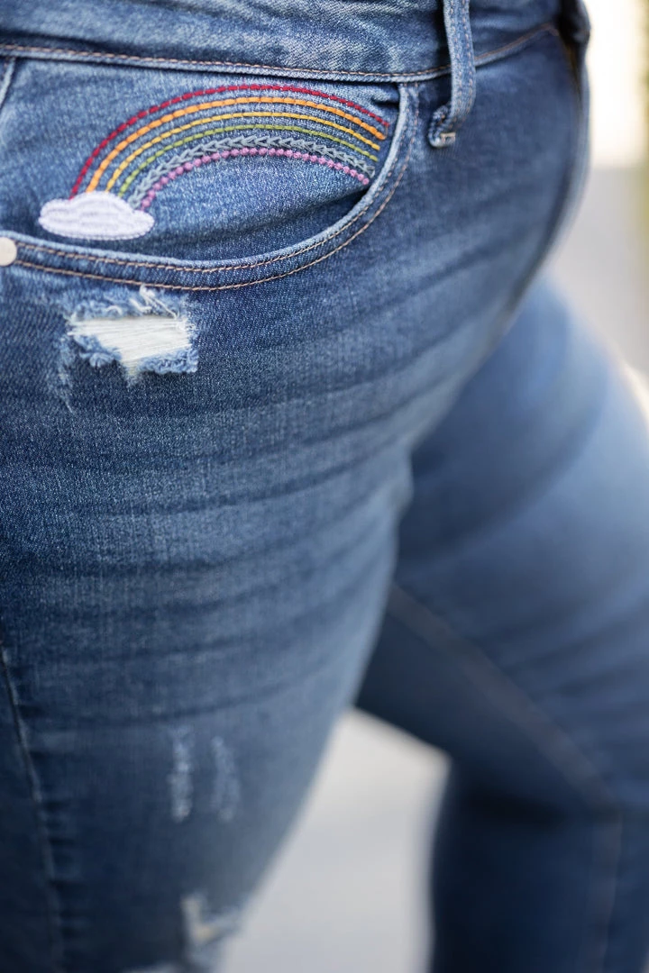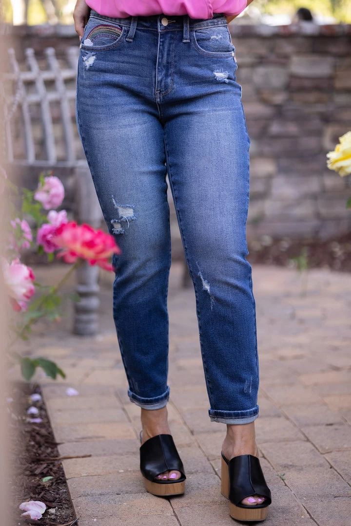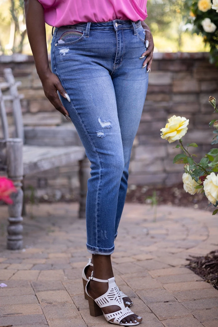 These high rise Judy Blues have the cutest rainbow embroidery on the right pocket. We are loving that relaxed fit, which makes it so easy to wear with a body suite to really show off that stitching.