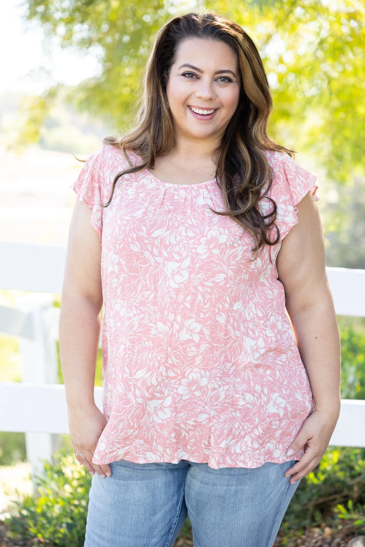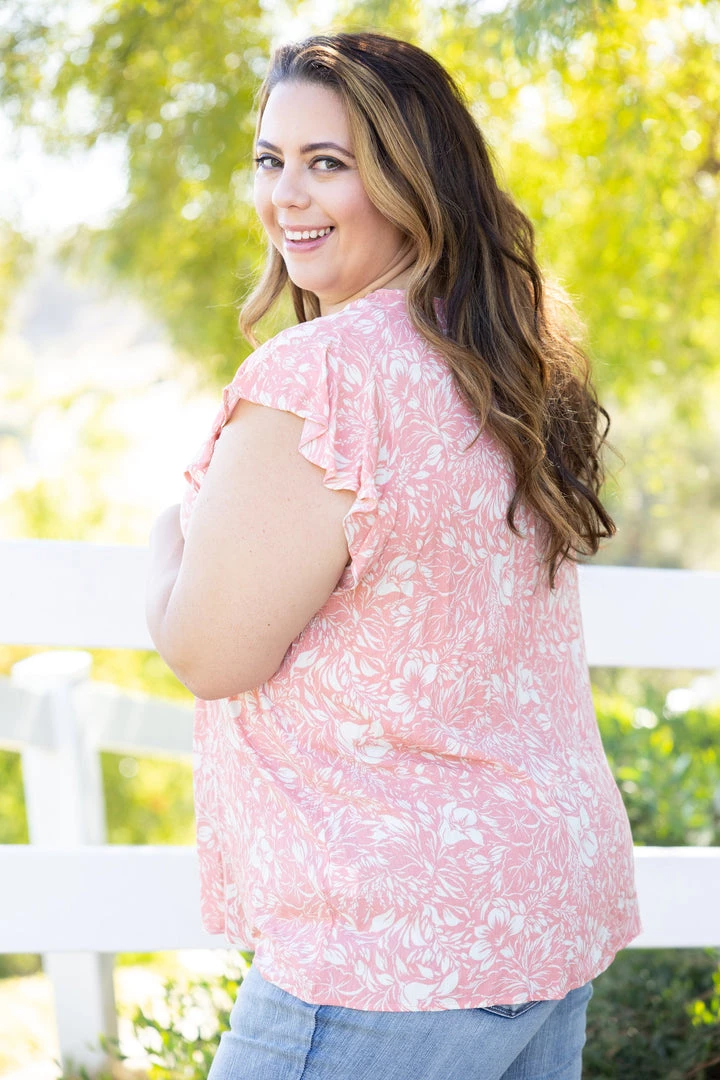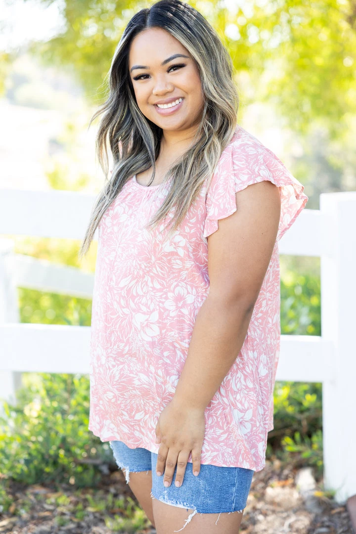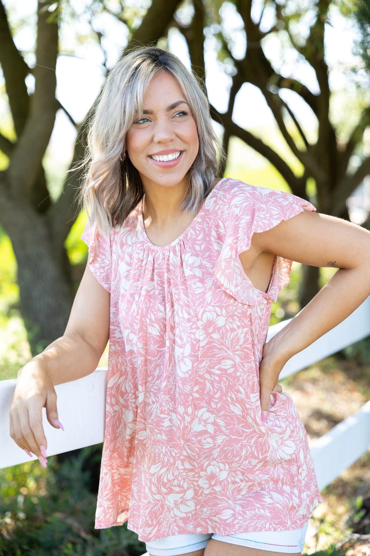 The color of this gorgeous floral printed flutter sleeve reminds of a sunset in paradise. Made from a lightweight gauze fabric, this top features a round neckline, rounded hem and flutter sleeves.