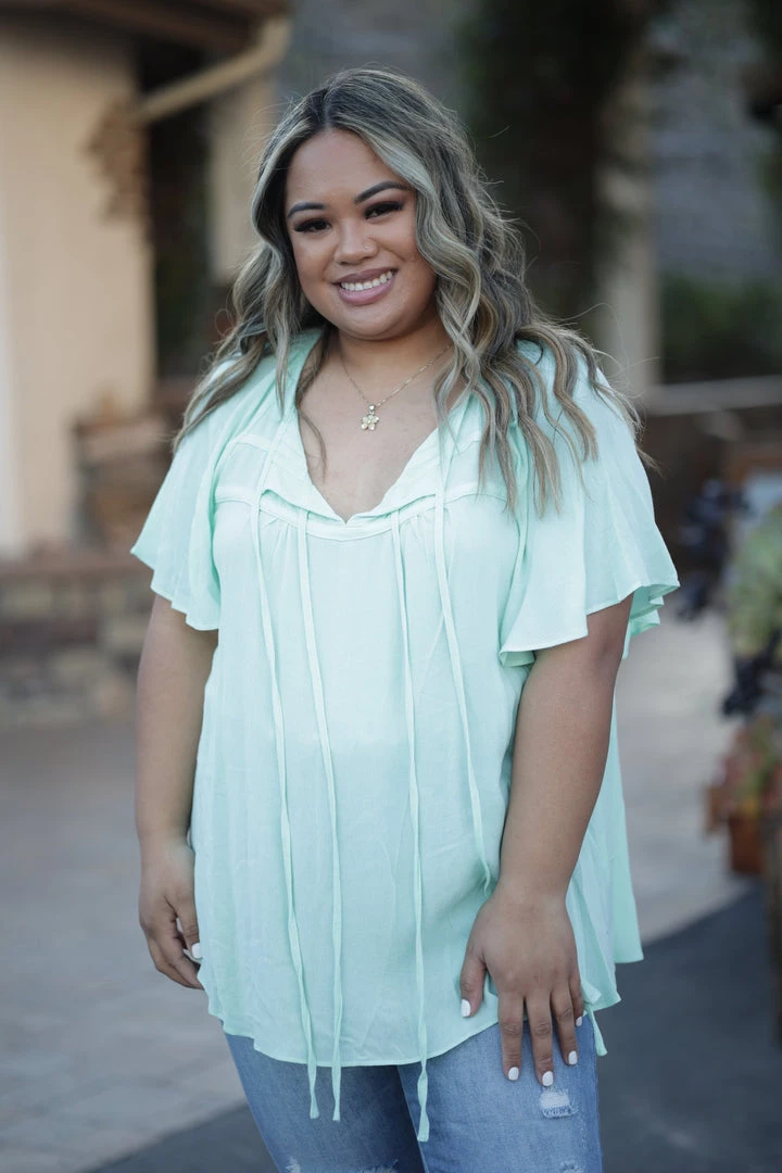 We are head over heels for this mint colored woven peasant top. Made from super soft crinkle rayon, this top features a strap tie bow round neck, short flutter sleeves and pin tuck detail on the front.