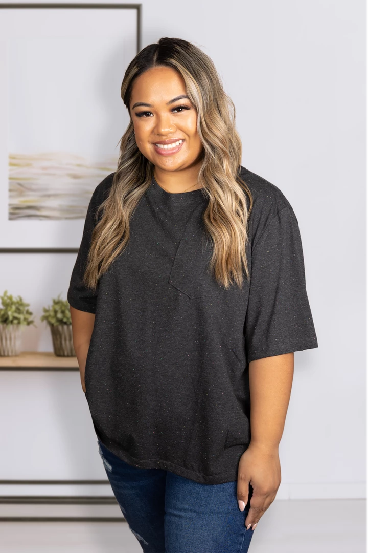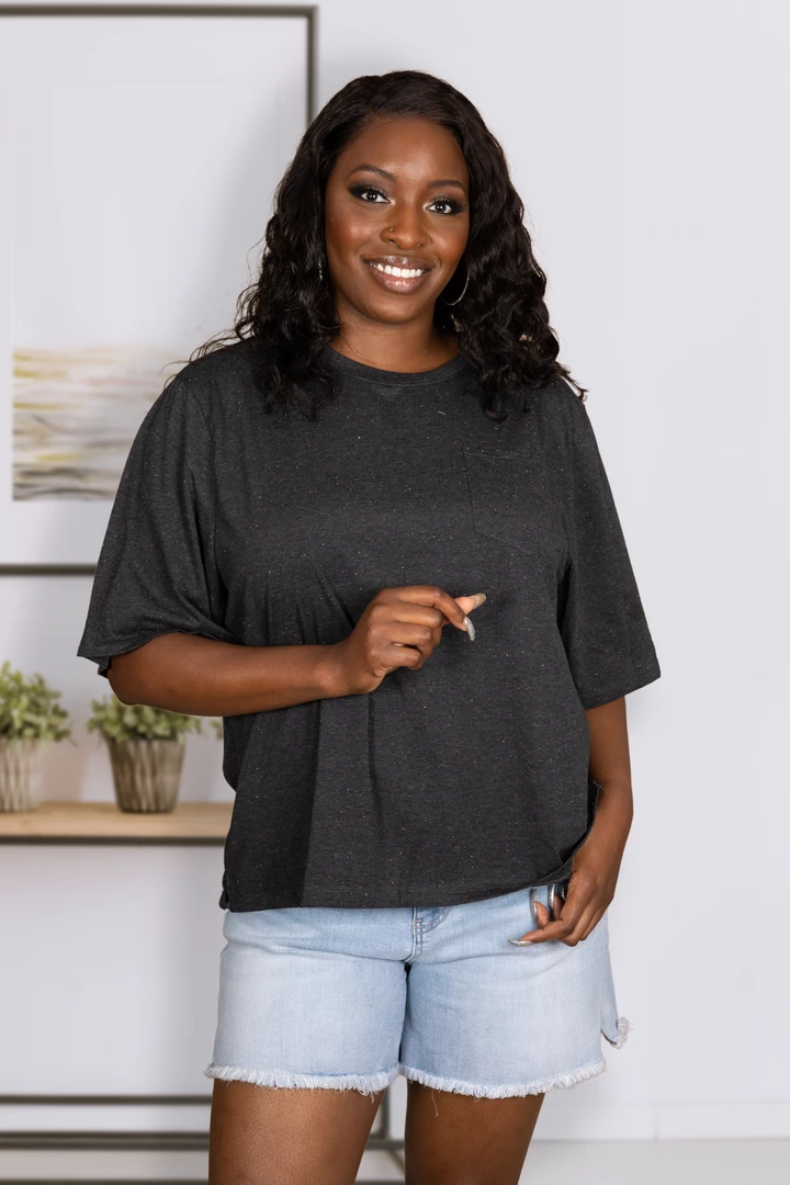 This black short sleeve top looks like it was sprinkled with pixie dust with all the neon specks of fabric throughout. With a relaxed fit, this top features a round neckline, short sleeves and front pocket detail.
