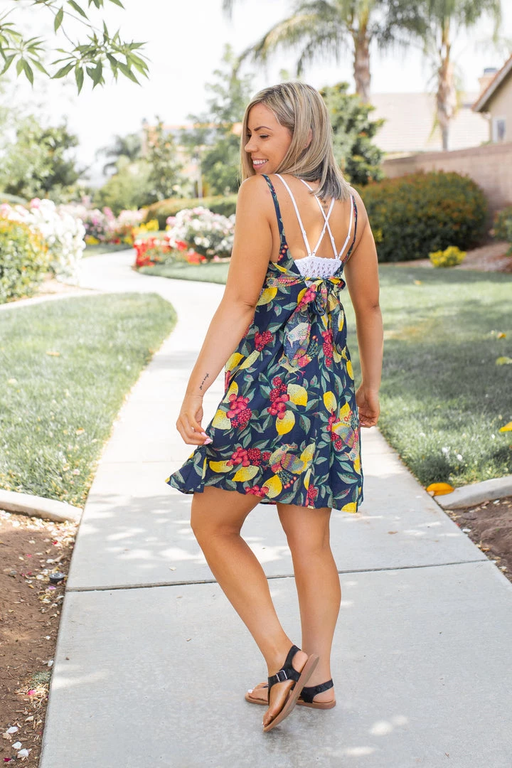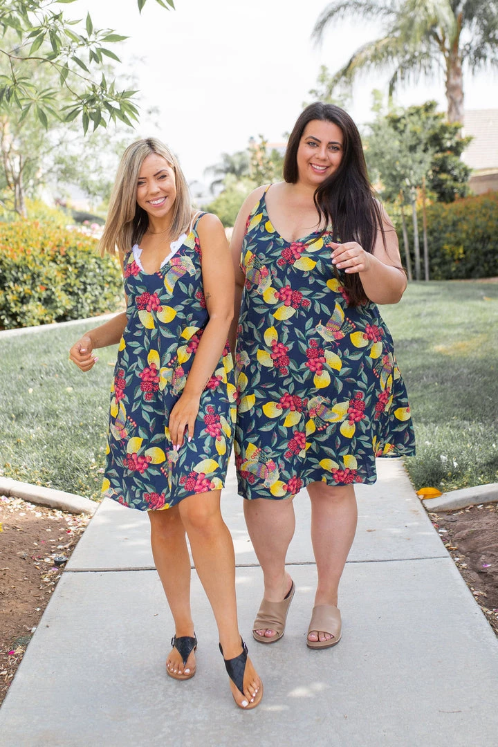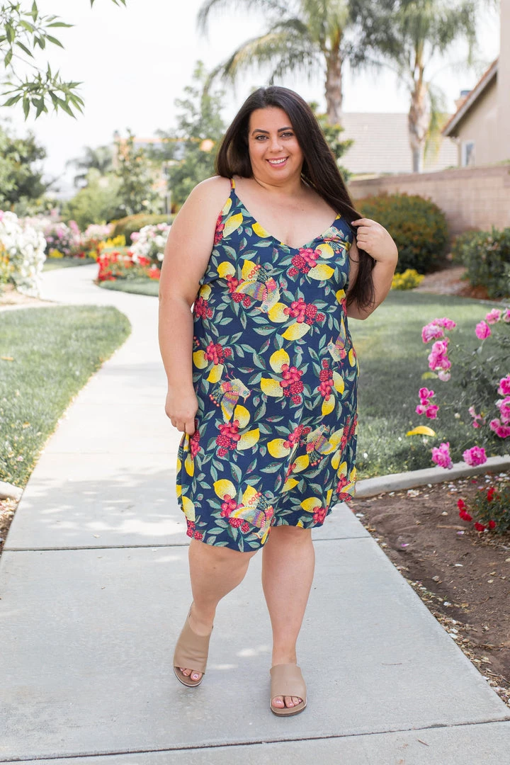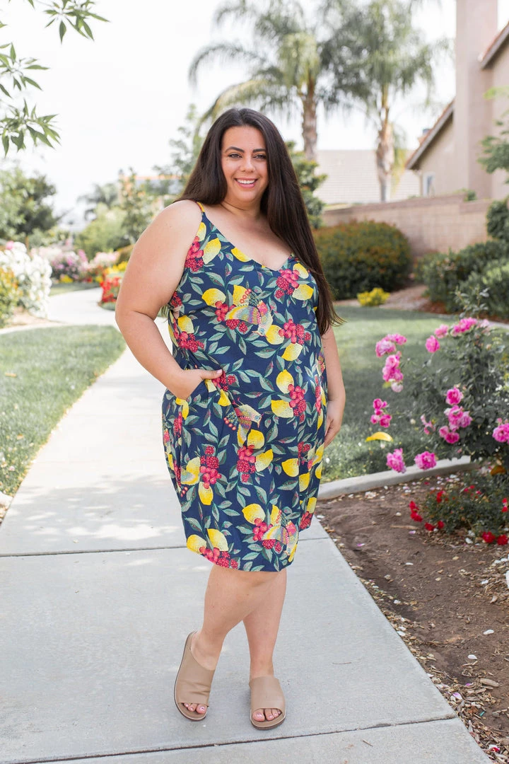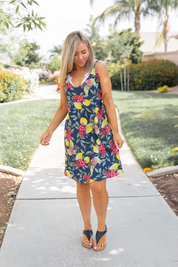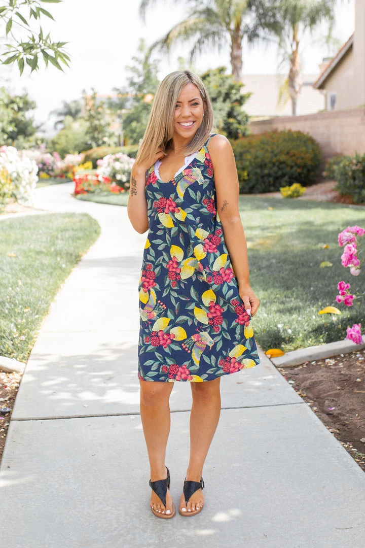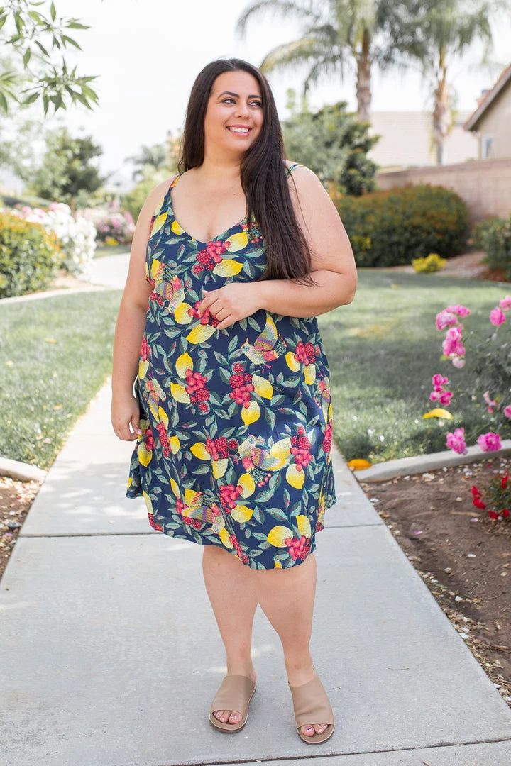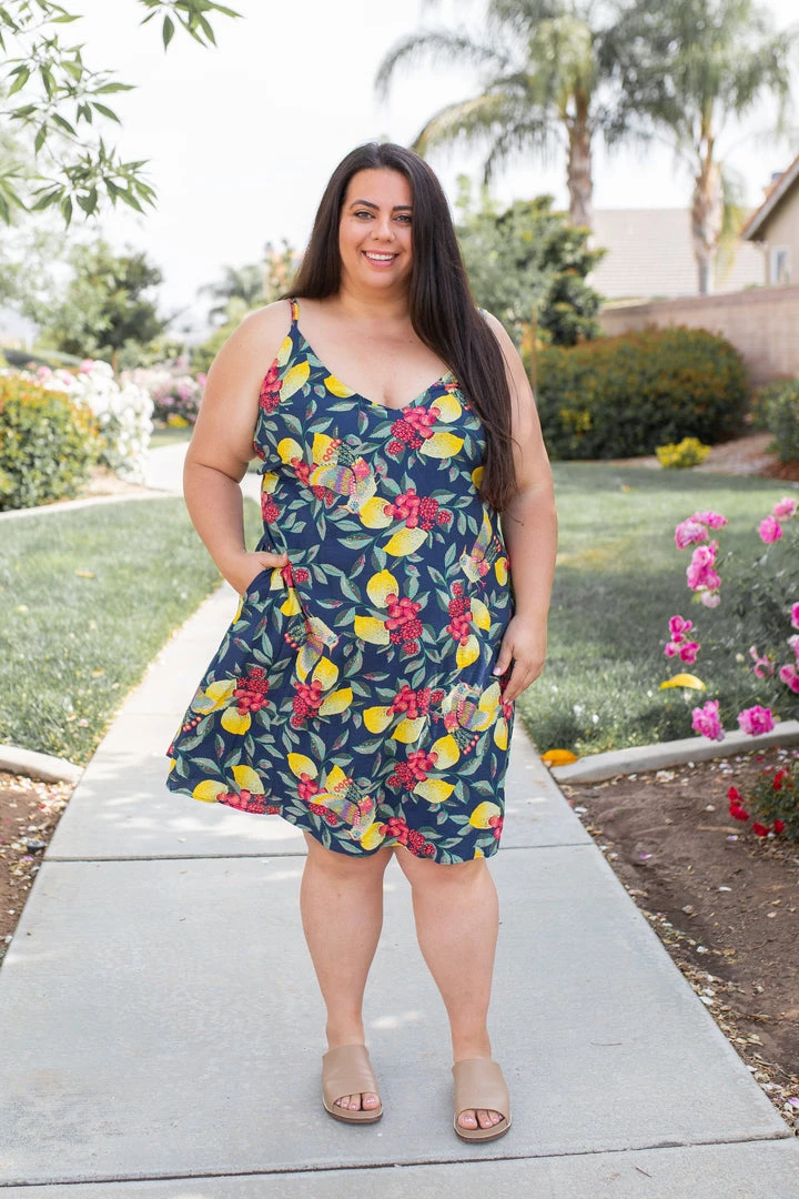 Like fresh squeezed lemons, this dress is as fresh as it gets. Seriously the perfect summer print with the lemons, berries and birds. With a relaxed fit, this dress has a self close tie in the back so you can really make it fit your body best. This dress is lined to perfection so there is nothing sheer about it, and it also has pockets!
