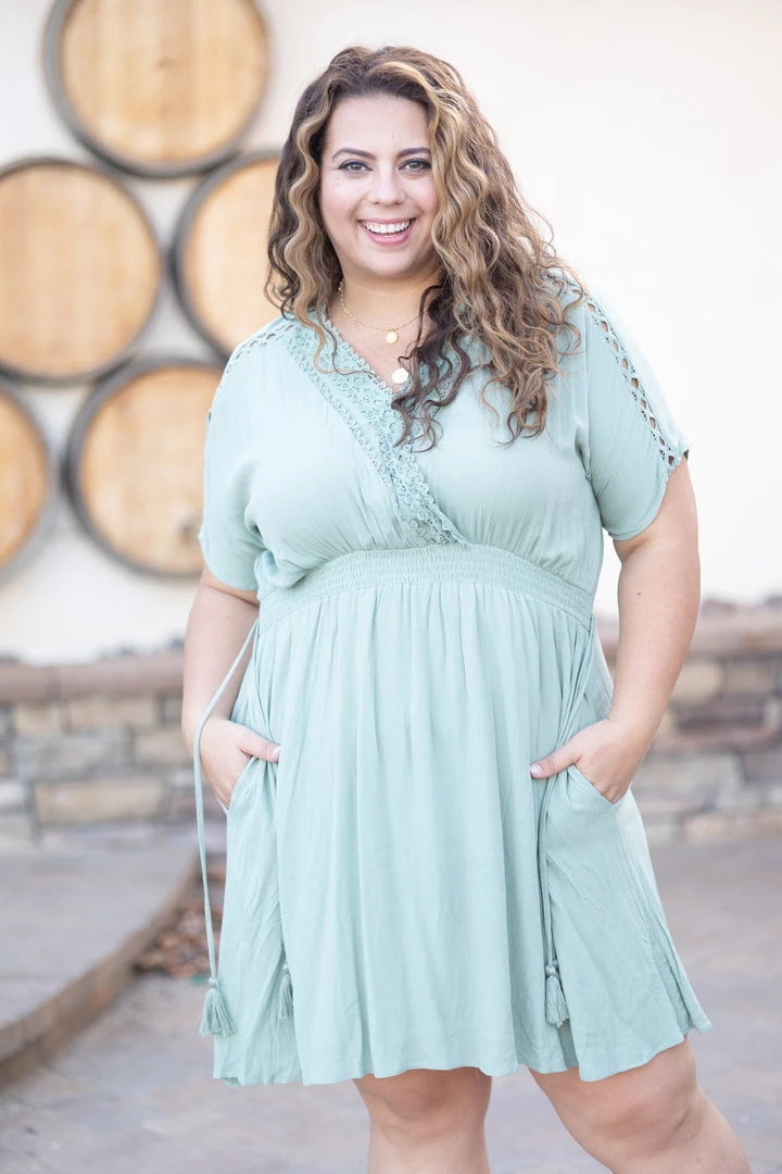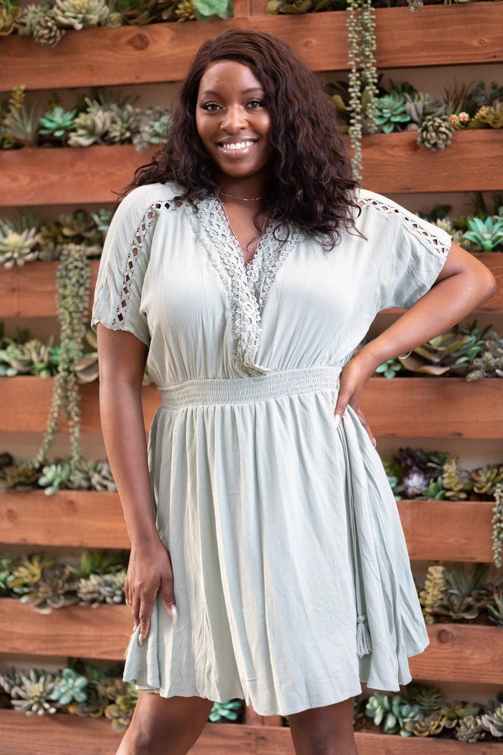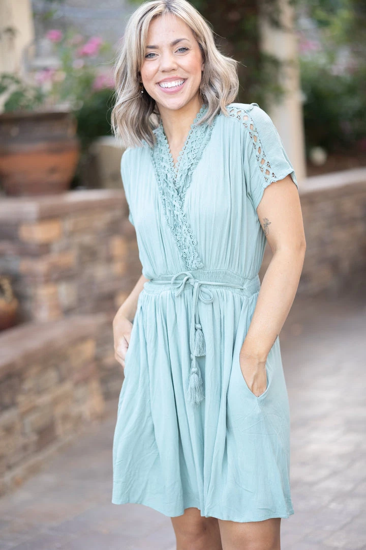 There is nothing else like this little sage dress. Everything about it is absolute perfection. That crochet detail throughout, the V-neck with adjustable button, short dolman sleeves, smocked waistline with tassel details…the list is endless.
