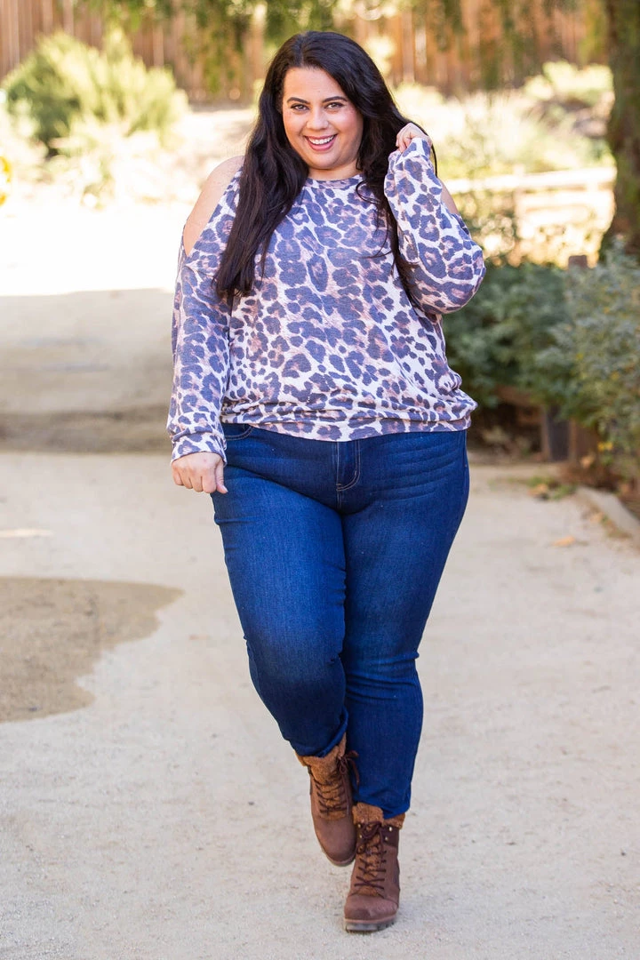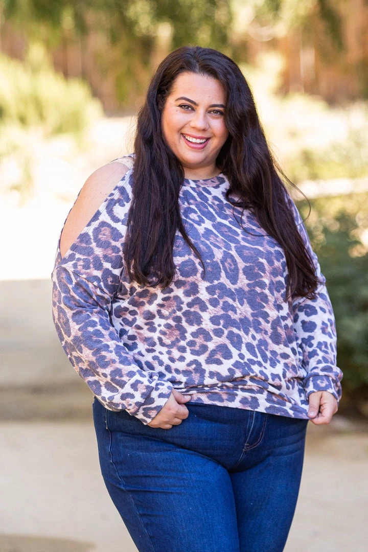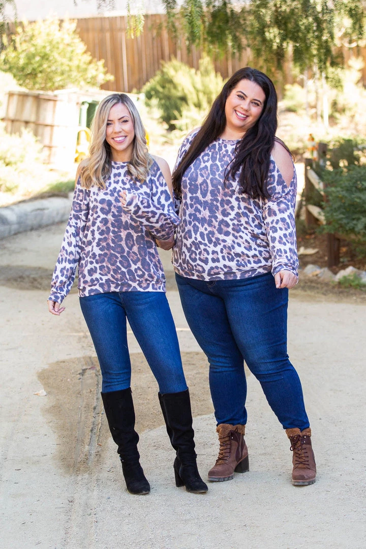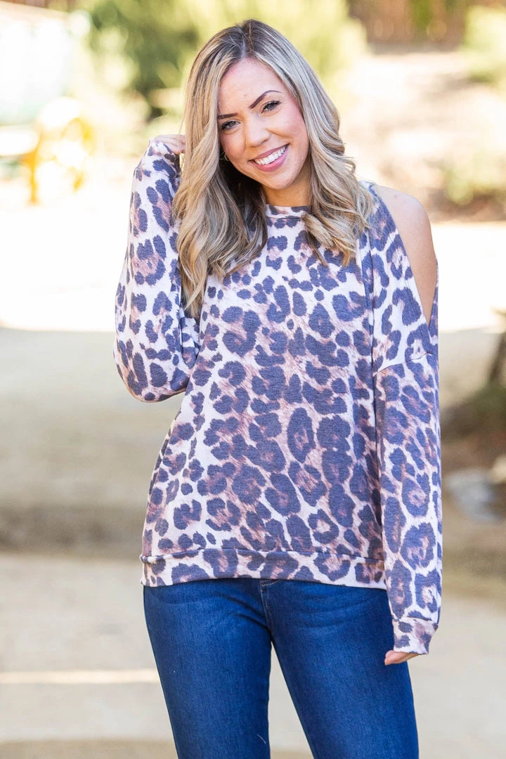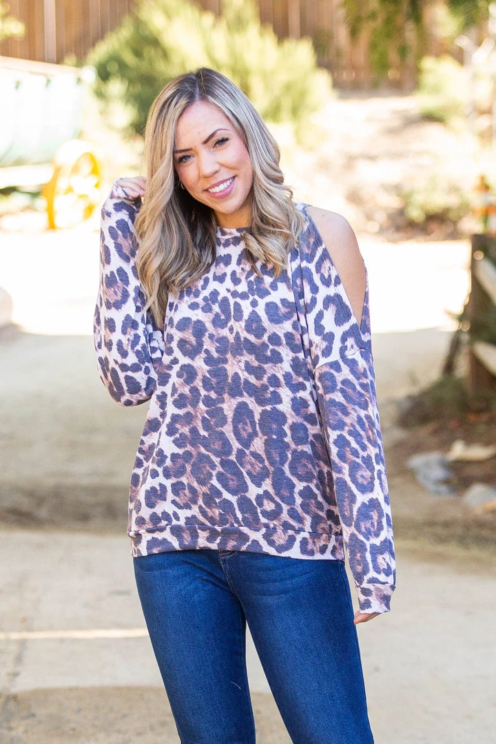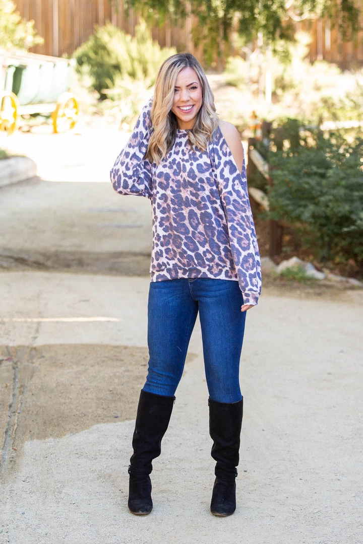 Roar around in this super soft and cozy cold shoulder. Featuring a round neckline and relaxed fit.