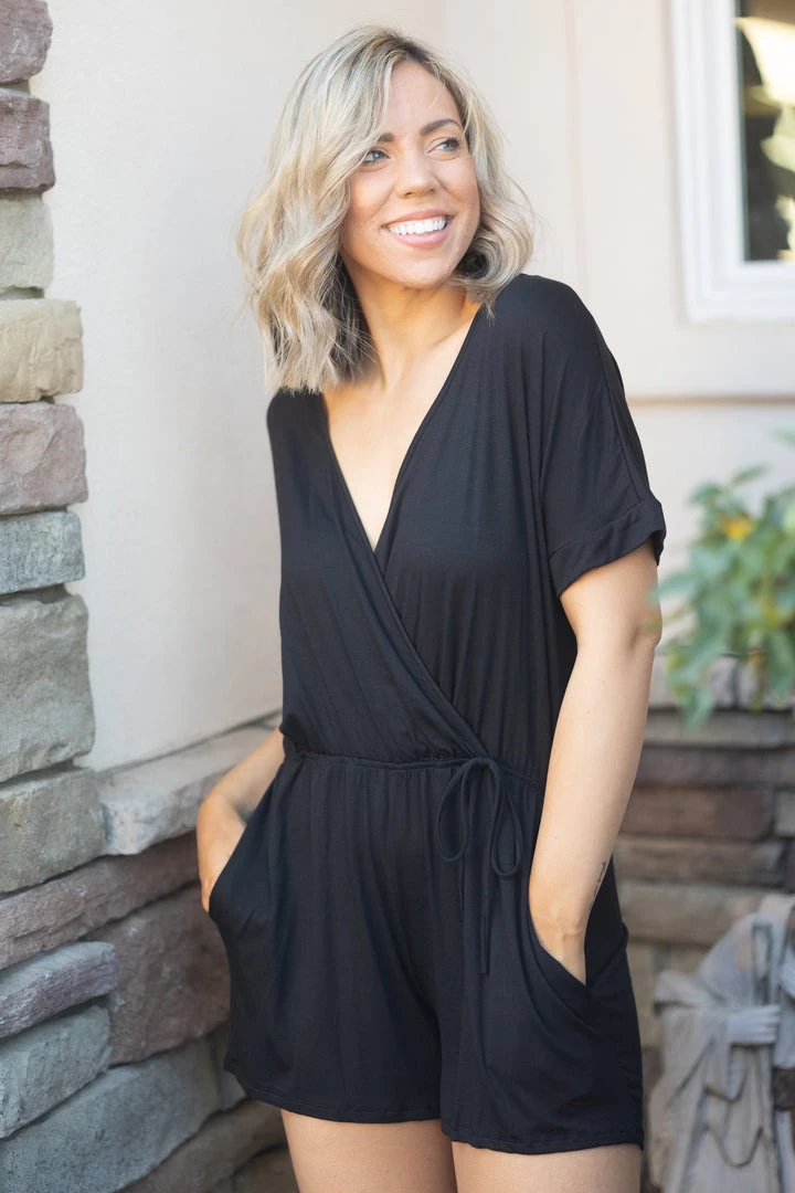 The only romper you’ll ever need and your closet is screaming for you to make this one yours! Featuring a comfortable relaxed fit, with elastic waistline, faux wrap v-neck top, short sleeves and pockets!Â