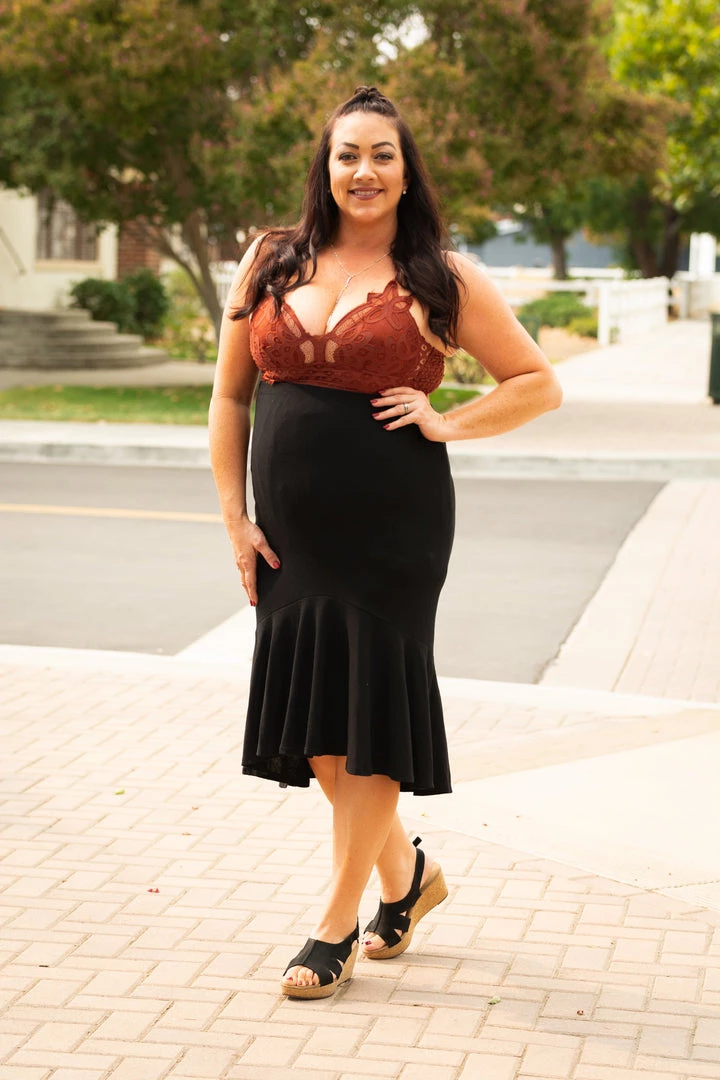 - Allison is 5’8″ wearing size Large (Paired with Opal Lace Trim Cami Top in Rust)