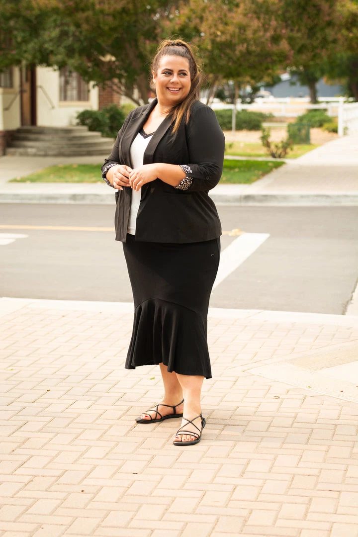 - Callie is 5’8 wearing size 3X (Paired with Classy Lace Trim Tank and Business Pizzaz Blazer)