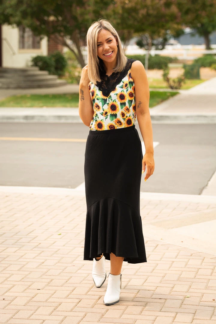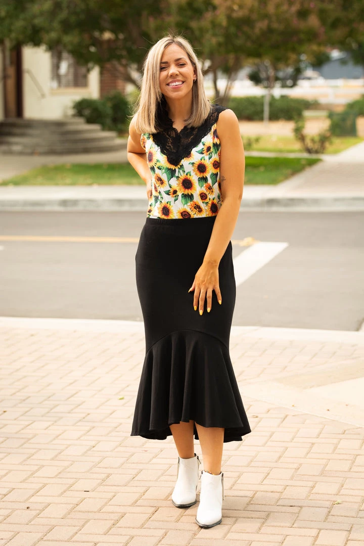 This solid black french terry mermaid skirt is the prefect piece to dress up or down with. With a hi lo hem and elastic waistband you will be able to wear this beauty with just about anything.