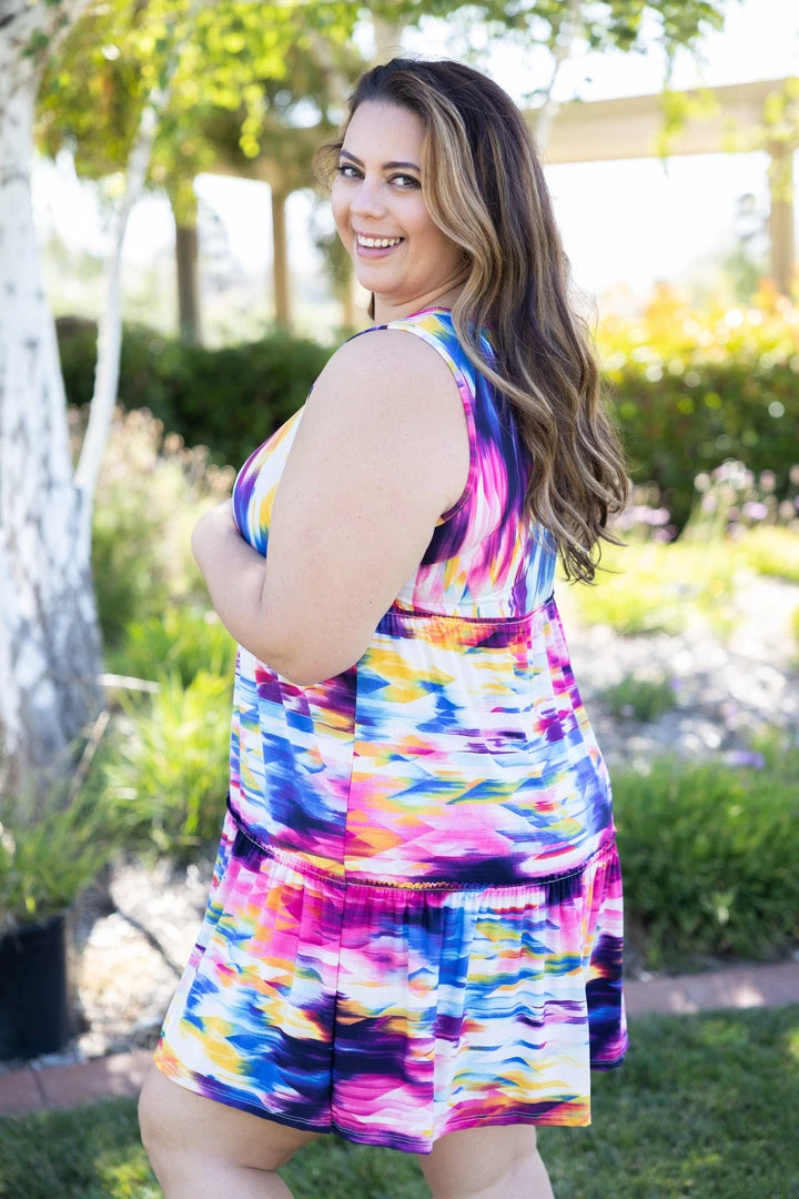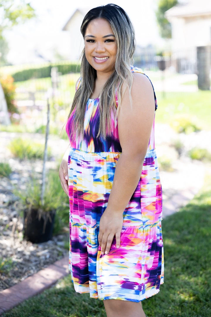 The perfect summery dress! The geometric rainbow print that go both horizontal & vertical and the lightweight fabric make us think of endless summer fun. With a relaxed fit, this dress features a round neckline an tiered ruffled hem.