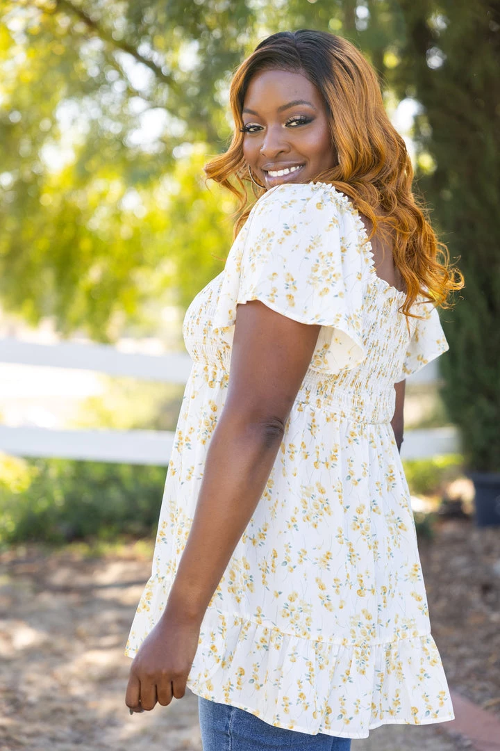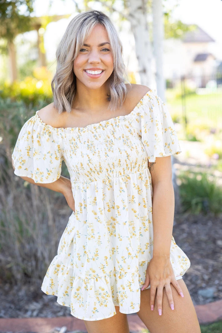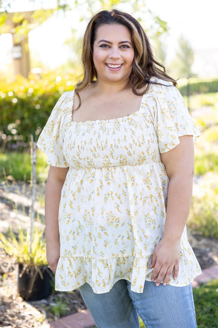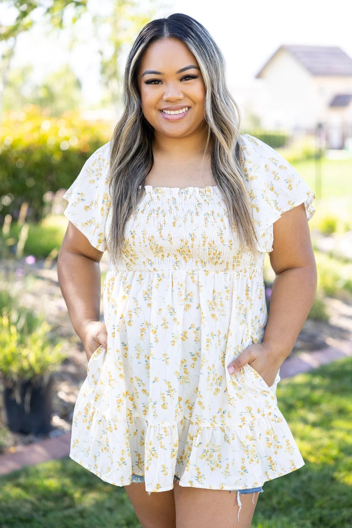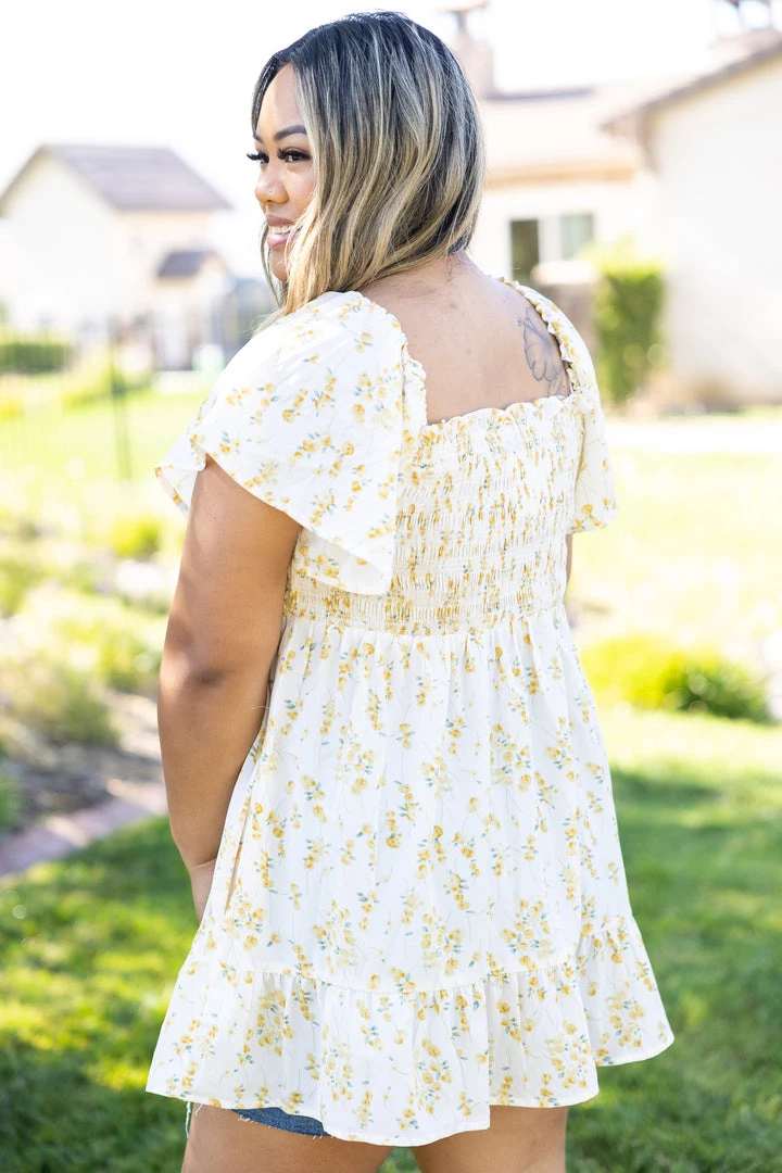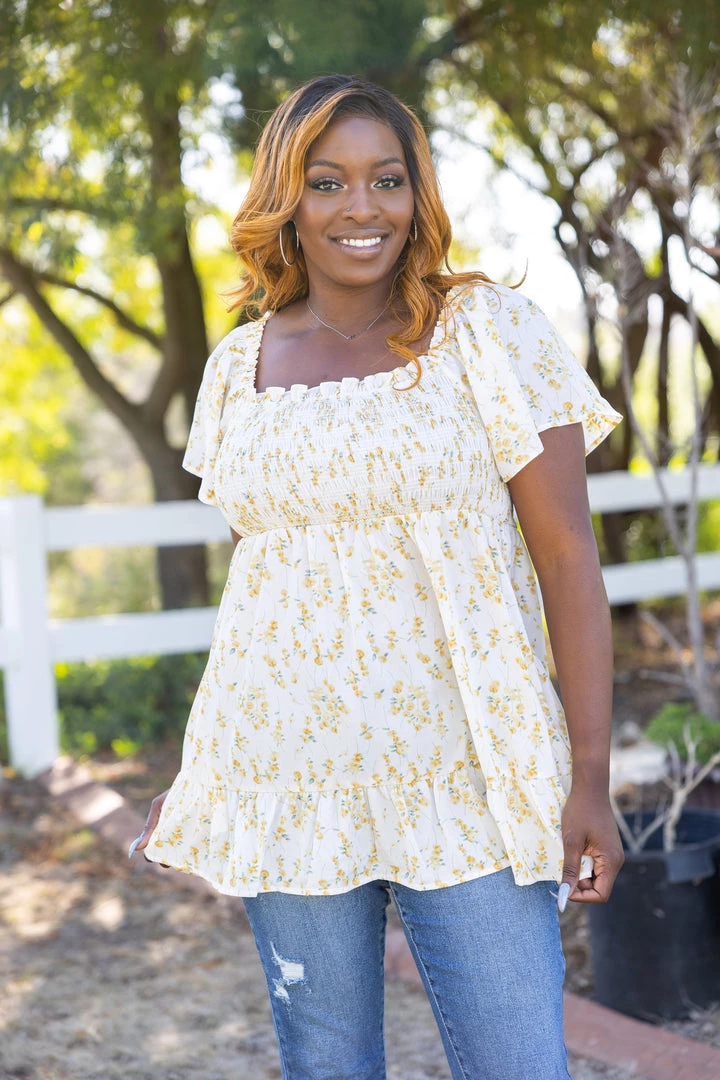 This smocked babydoll will keep you feeling great from sunrise to sunset. The floral print is to die for, and that fit is impeccable. With a relaxed fit, this top features a smocked chest, square neckline, short bell sleeves and ruffled hem. Â