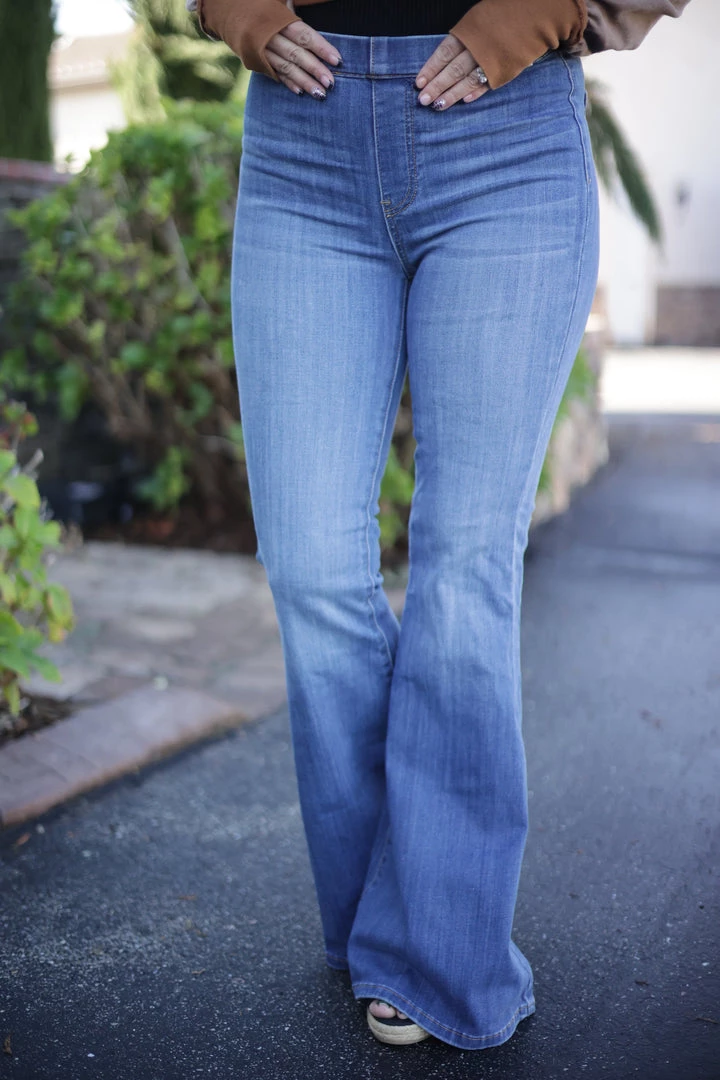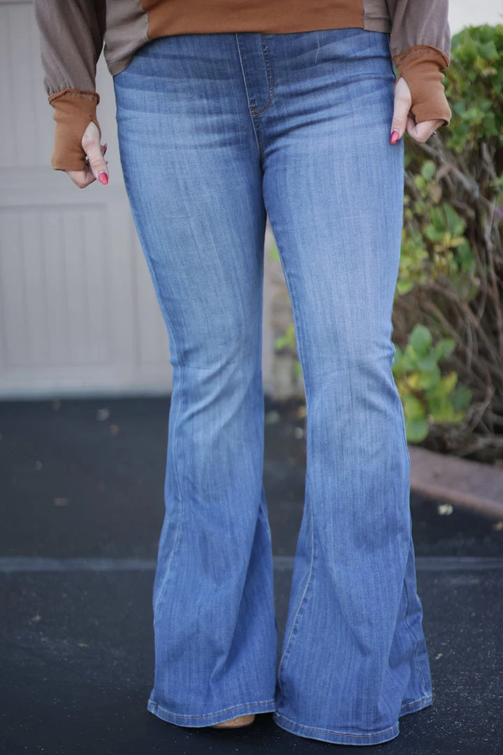 Judy Blue has done it again with these amazing super flare jeggings. The medium wash flared jegging features a flattering flared fit, a faded wash, and light whisker detail. Additionally it has two faux front pockets and two back real pockets. Very Stretchy waistband, comfortable wear and lots of length.